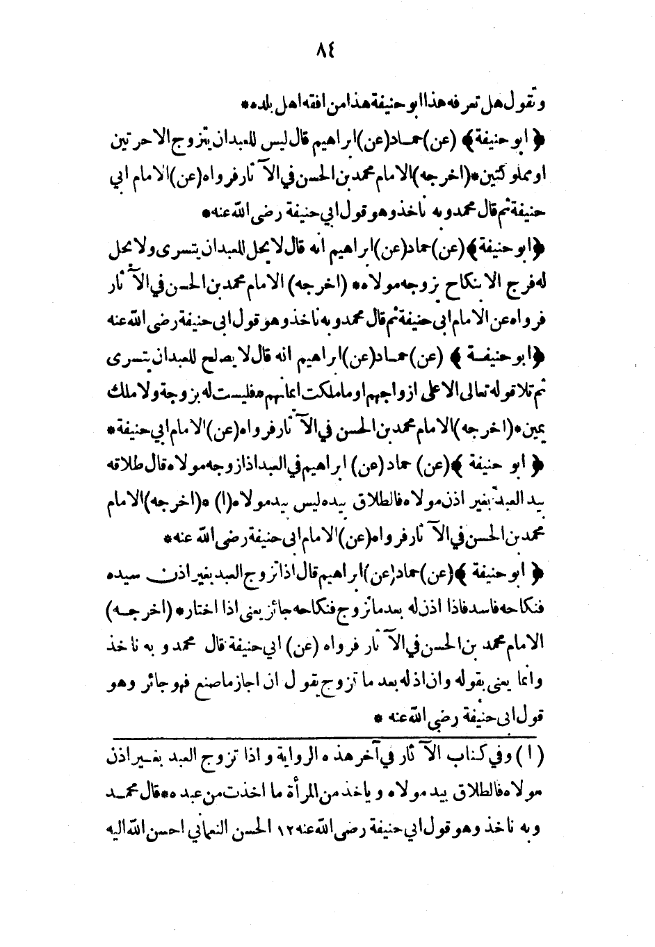 (أبو حنيفة) (عن) حماد (عن) إبراهيم قال ليس للعبد أن يتزوج إلا حرتين أو مملوكتين* (أخرجه) الإمام محمد بن الحسن في الآثار فرواه (عن) الإمام أبي حنيفة ثم قال محمد وبه نأخذ وهو قول أبي حنيفة رضي الله عنه*