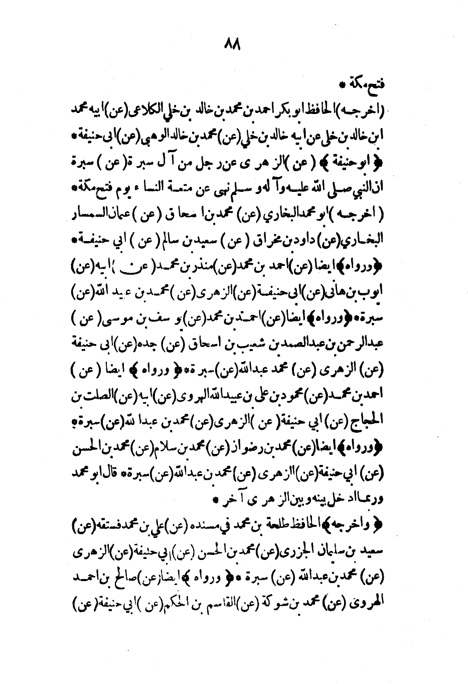 (أبو حنيفة) (عن) الزهري عن رجل من آل سبرة (عن) سبرة أن النبي صلى الله عليه وآله وسلم نهى عن متعة النساء يوم فتح مكة* (أخرجه) أبو محمد البخاري (عن) محمد بن إسحاق (عن) عثمان السمسار البخاري (عن) داود بن مخراق (عن) سعيد بن سالم (عن) أبي حنيفة* (ورواه) أيضاً (عن) أحمد بن محمد (عن) منذر بن محمد (عن) أبيه (عن) أيوب بن هاني (عن) أبي حنيفة (عن) الزهري (عن) محمد بن عبد الله (عن) سبرة* (ورواه) أيضاً (عن) أحمد بن محمد (عن) يوسف بن موسى (عن) عبد الرحمن بن عبد الصمد بن شعيب بن إسحاق (عن) جده (عن) أبي حنيفة (عن) الزهري (عن) محمد عبيد الله (عن) سبرة* (ورواه) أيضاً (عن) أحمد بن محمد (عن) محمود بن علي بن عبيد الله الهروي (عن) أبيه (عن) الصلت بن الحجاج (عن) أبي حنيفة (عن) الزهري (عن) محمد بن عبد الله (عن) سبرة* (ورواه) أيضاً (عن) محمد بن رضوان (عن) محمد بن سلام (عن) محمد بن الحسن (عن) أبي حنيفة (عن) الزهري (عن) محمد بن عبد الله (عن) سبرة* قال أبو محمد وربما أدخل بينه وبين الزهري آخر*
