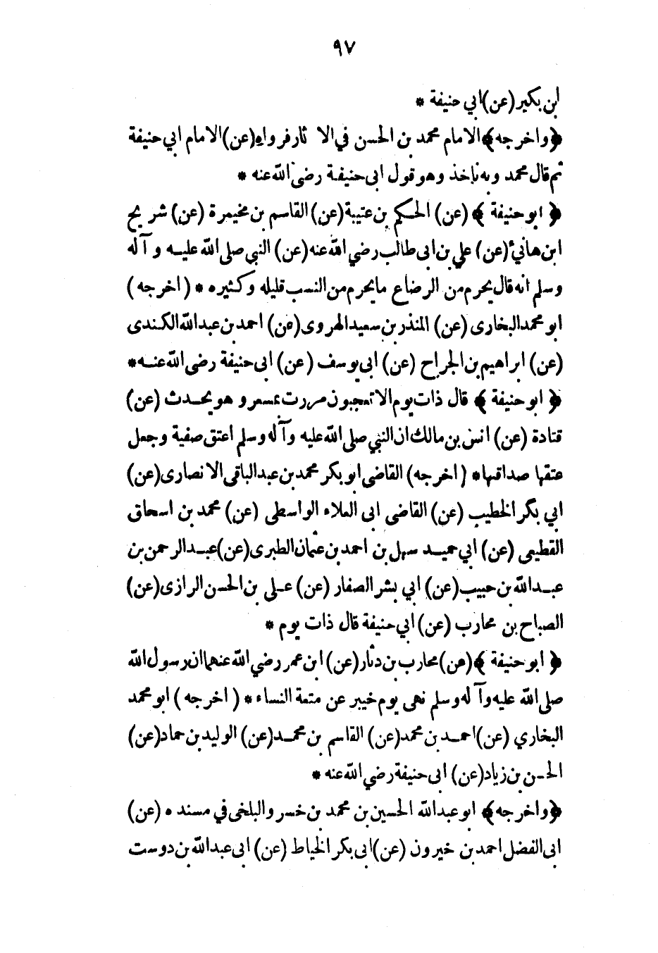 (أبو حنيفة) (عن) الحكم بن عتيبة (عن) القاسم بن مخيمرة (عن) شريح ابن هانئ (عن) علي بن أبي طالب رضي الله عنه (عن) النبي صلى الله عليه وآله وسلم أنه قال يحرم من الرضاع ما يحرم من النسب قليله وكثيره* (أخرجه) أبو محمد البخاري (عن) المنذر بن سعيد الهروي (عن) أحمد بن عبد الله الكندي (عن) إبراهيم بن الجراح (عن) أبي يوسف (عن) أبي حنيفة رضي الله عنه* (أبو حنيفة) قال ذات يوم ألا تعجبون مررت بمسعر وهو يحدث (عن) قتادة (عن) أنس بن مالك أن النبي صلى الله عليه وآله وسلم أعتق صفية وجعل عتقها صداقها* (أخرجه) القاضي أبو بكر محمد بن عبد الباقي الأنصاري (عن) أبي بكر الخطيب (عن) القاضي أبي العلاء الواسطي (عن) محمد بن إسحاق القطيعي (عن) أبي حميد سهل بن أحمد بن عثمان الطبري (عن) عبد الرحمن بن عبد الله بن حبيب (عن) أبي بشر الصفار (عن) علي بن الحسن الرازي (عن) الصباح بن محارب (عن) أبي حنيفة قال ذات يوم*