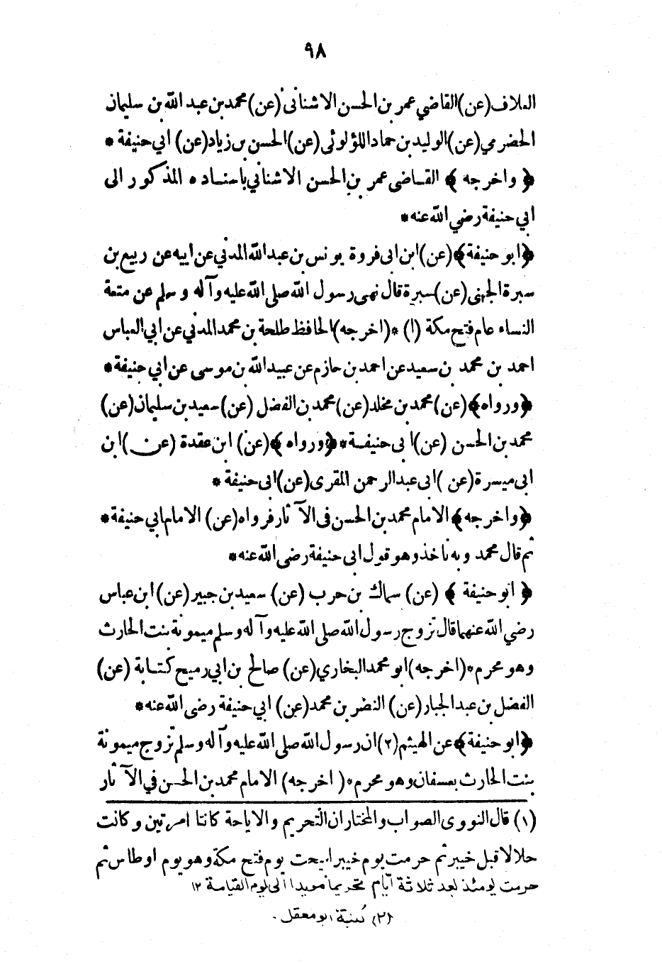 (أبو حنيفة) (عن) ابن أبي فروة يونس بن عبد الله المدني عن أبيه عن ربيع بن سبرة الجهني (عن) سبرة قال نهى رسول الله صلى الله عليه وآله وسلم عن متعة النساء عام فتح مكة* (أخرجه) الحافظ طلحة بن محمد المدني عن أبي العباس أحمد بن محمد بن سعيد عن أحمد بن حازم عن عبيد الله بن موسى عن أبي حنيفة* (ورواه) (عن) محمد بن مخلد (عن) محمد بن الفضل (عن) سعيد بن سليمان (عن) محمد بن الحسن (عن) أبي حنيفة* (ورواه) (عن) ابن عقدة (عن) ابن أبي ميسرة (عن) أبي عبد الرحمن المقري (عن) أبي حنيفة*