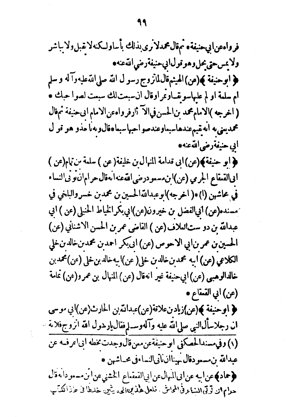 (أبو حنيفة) (عن) أبي قدامة المنهال بن خليفة (عن) سلمة بن تمام (عن) أبي القعقاع الجرمي (عن) ابن مسعود رضي الله عنه أنه قال حرام أن تؤتى النساء في محاشهن* (أخرجه) أبو عبد الله الحسين بن محمد بن خسرو البلخي في مسنده (عن) أبي الفضل بن خيرون (عن) أبي بكر الخياط الحنبلي (عن) أبي عبد الله بن دوست العلاف (عن) القاضي عمر بن الحسن الأشناني (عن) الحسين بن عمر بن أبي الأحوص (عن) أبي بكر أحمد بن محمد بن خالد بن خلي الكلاعي (عن) أبيه محمد بن خالد بن خلي (عن) أبيه خالد بن خلي (عن) محمد بن خالد الوهبي (عن) أبي حنيفة غير أنه قال (عن) المنهال بن عمرو (عن) ثمامة (عن) أبي القعقاع*