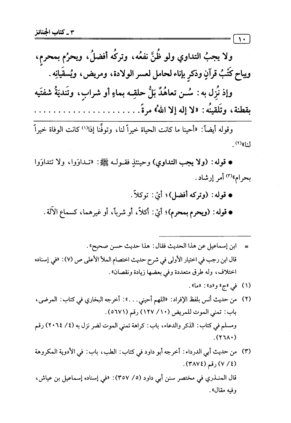 * قوله: (ولا يجب التداوي) وحينئذٍ فقوله -صلى اللَّه عليه وسلم-: "تداوَوا، ولا تتداوَوا بحرام" (¬3) أمر إرشاد.