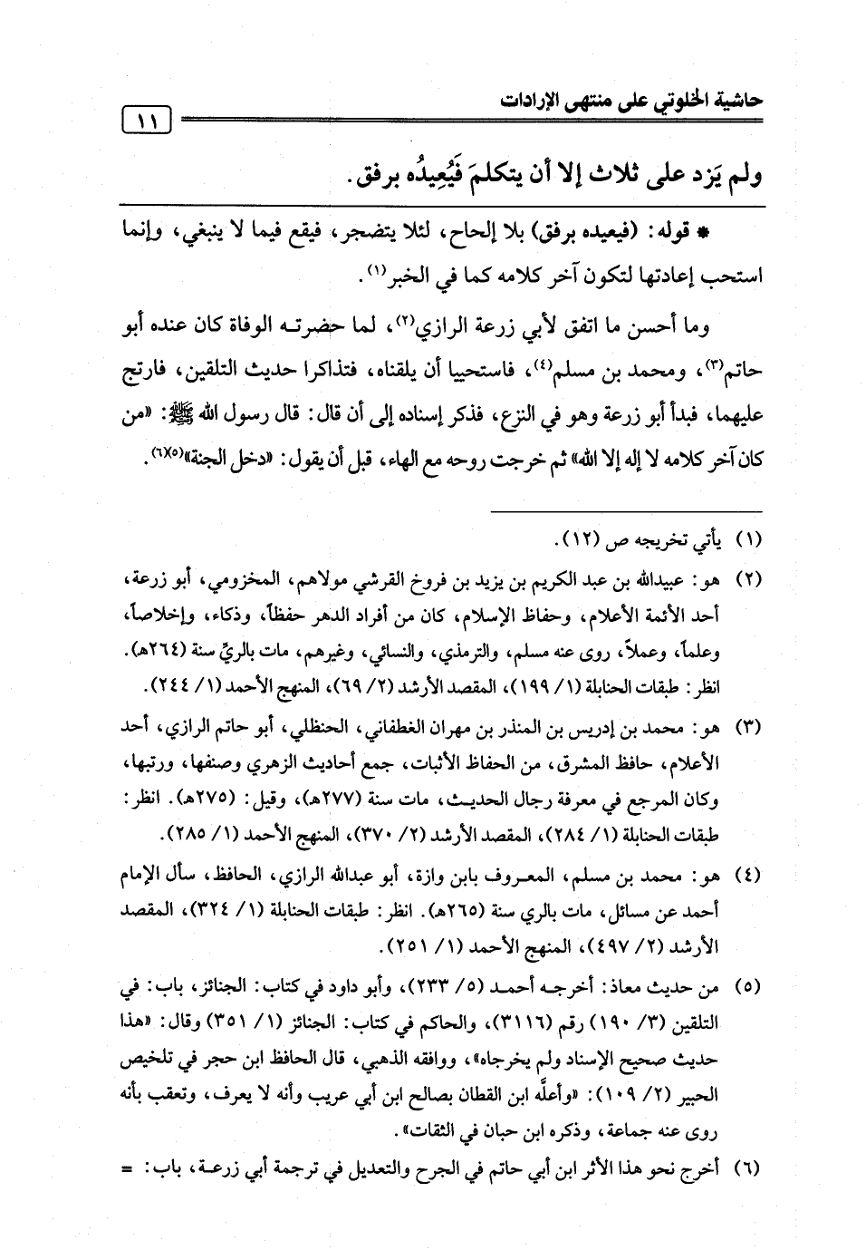 وما أحسن ما اتفق لأبي زرعة الرازي (¬2)، لما حضرته الوفاة كان عنده أبو حاتم (¬3)، ومحمد بن مسلم (¬4)، فاستحييا أن يلقناه، فتذاكرا حديث التلقين، فارتج عليهما، فبدأ أبو زرعة وهو في النزع، فذكر إسناده إلى أن قال: قال رسول اللَّه -صلى اللَّه عليه وسلم-: "من كان آخر كلامه لا إله إلا اللَّه" ثم خرجت روحه مع الهاء، قبل أن يقول: "دخل الجنة" (¬5) (¬6).