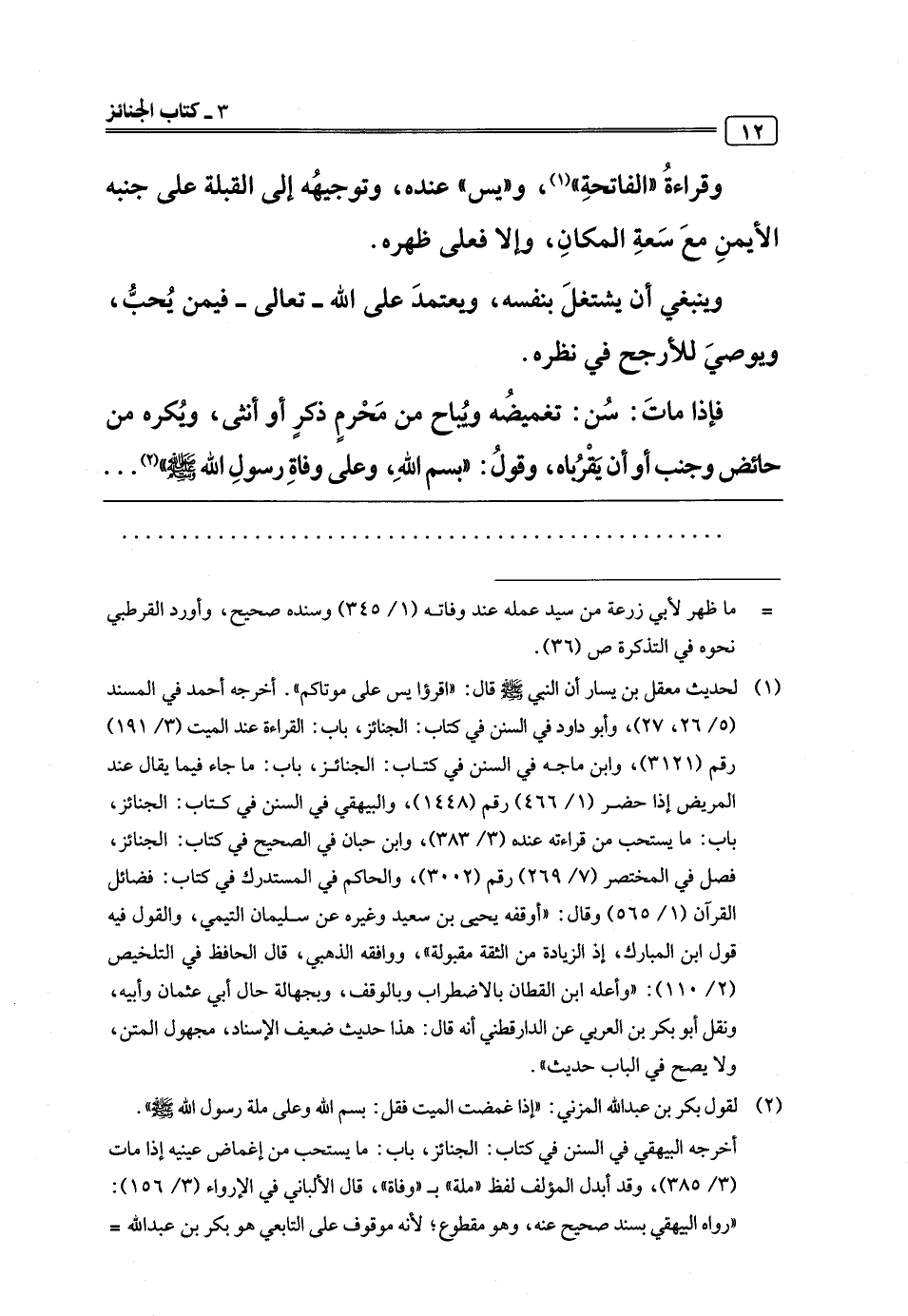 (¬1) لحديث معقل بن يسار أن النبي -صلى اللَّه عليه وسلم- قال: "اقرؤا يس على موتاكم". أخرجه أحمد في المسند (5/ 26، 27)، وأبو داود في السنن في كتاب: الجنائز، باب: القراءة عند الميت (3/ 191) رقم (3121)، وابن ماجه في السنن في كتاب: الجنائز، باب: ما جاء فيما يقال عند المريض إذا حضر (1/ 466) رقم (1448)، والبيهقي في السنن في كتاب: الجنائز، باب: ما يستحب من قراءته عنده (3/ 383)، وابن حبان في الصحيح في كتاب: الجنائز، فصل في المختصر (7/ 269) رقم (3002)، والحاكم في المستدرك في كتاب: فضائل القرآن (1/ 565) وقال: "أوقفه يحيى بن سعيد وغيره عن سليمان التيمي، والقول فيه قول ابن المبارك، إذ الزيادة من الثقة مقبولة"، ووافقه الذهبي، قال الحافظ في التلخيص (2/ 110): "وأعله ابن القطان بالاضطراب وبالوقف، وبجهالة حال أبي عثمان وأبيه، ونقل أبو بكر بن العربي عن الدارقطني أنه قال: هذا حديث ضعيف الإسناد، مجهول المتن، ولا يصح في الباب حديث".