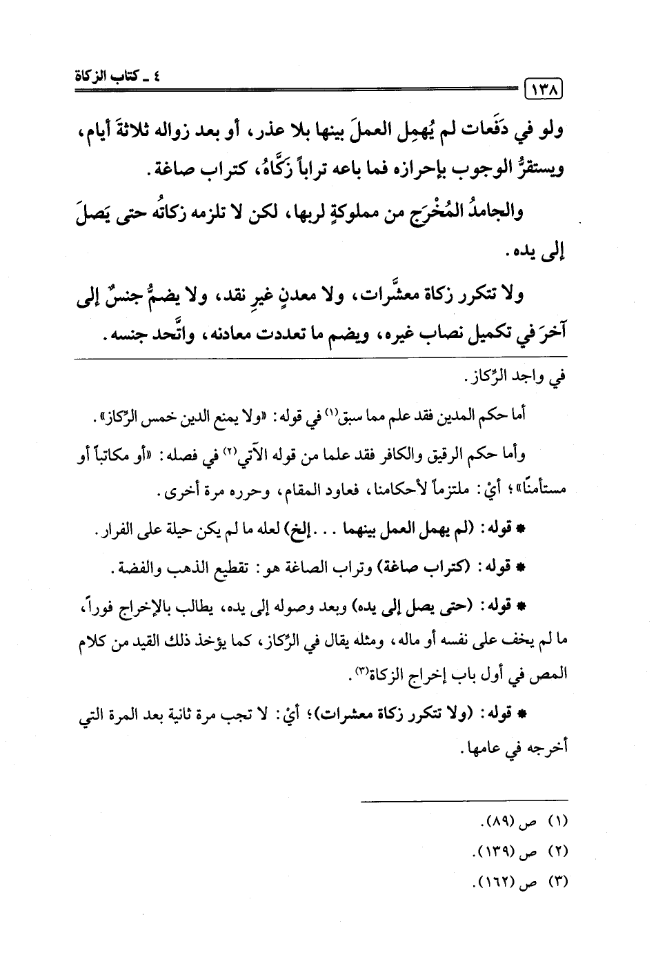 ولا تتكرر زكاة معشَّرات، ولا معدنٍ غيرِ نقد، ولا يضمُّ جنسٌ إلى آخرَ في تكميل نصاب غيره، وبضم ما تعددت معادنه، واتَّحد جنسه.