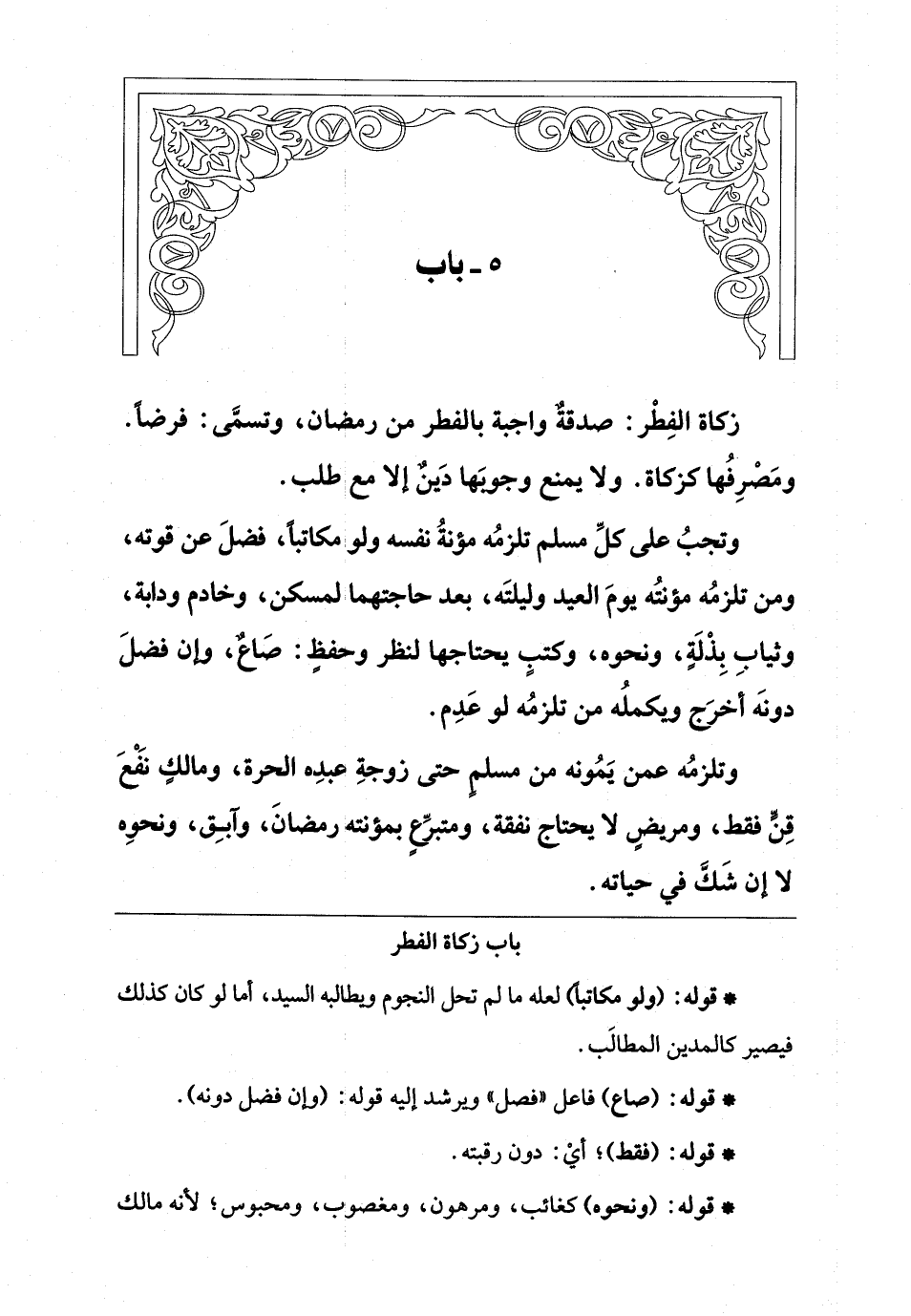 وتجبُ على كلِّ مسلم تلزمُه مؤنةُ نفسه ولو مكاتبًا، فضلَ عن قوته، ومن تلزمُه مؤنتُه يومَ العيد وليلتَه، بعد حاجتهما لمسكن، وخادم ودابة، وثيابِ بِذْلَةٍ، ونحوه، وكتبٍ يحتاجها لنظر وحفظٍ: صَاعٌ، وإن فضلَ دونَه أخرَج ويكملُه من تلزمُه لو عَدِم.