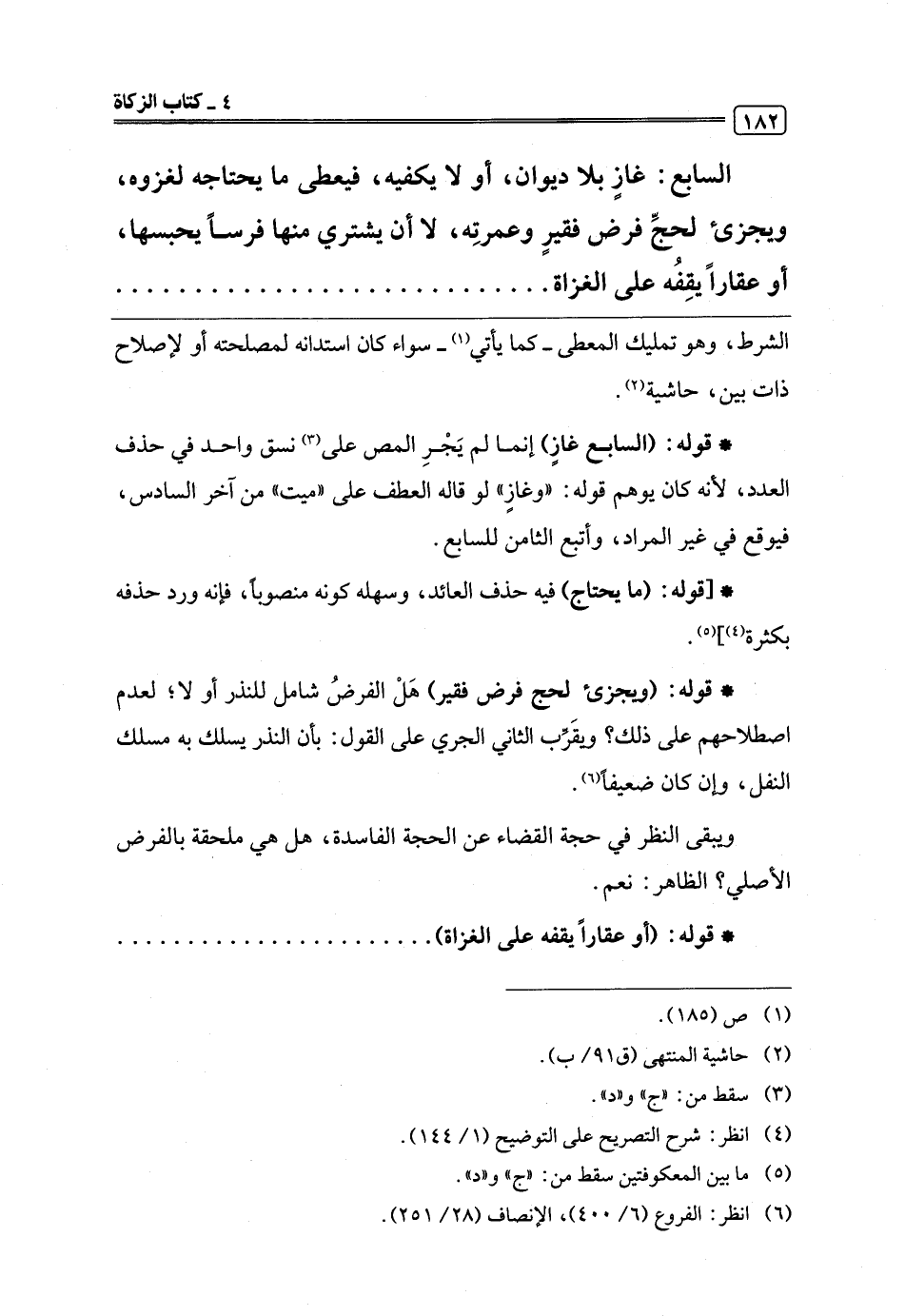 السابع: غازٍ بلا ديوان، أو لا يكفيه، فيعطى ما يحتاجه لغزوه، ويجزئ لحجِّ فرض فقيرٍ وعمرتِه، لا أن يشتري منها فرسًا يحبسها، أو عقارًا يقِفُه على الغزاة. . . . . .