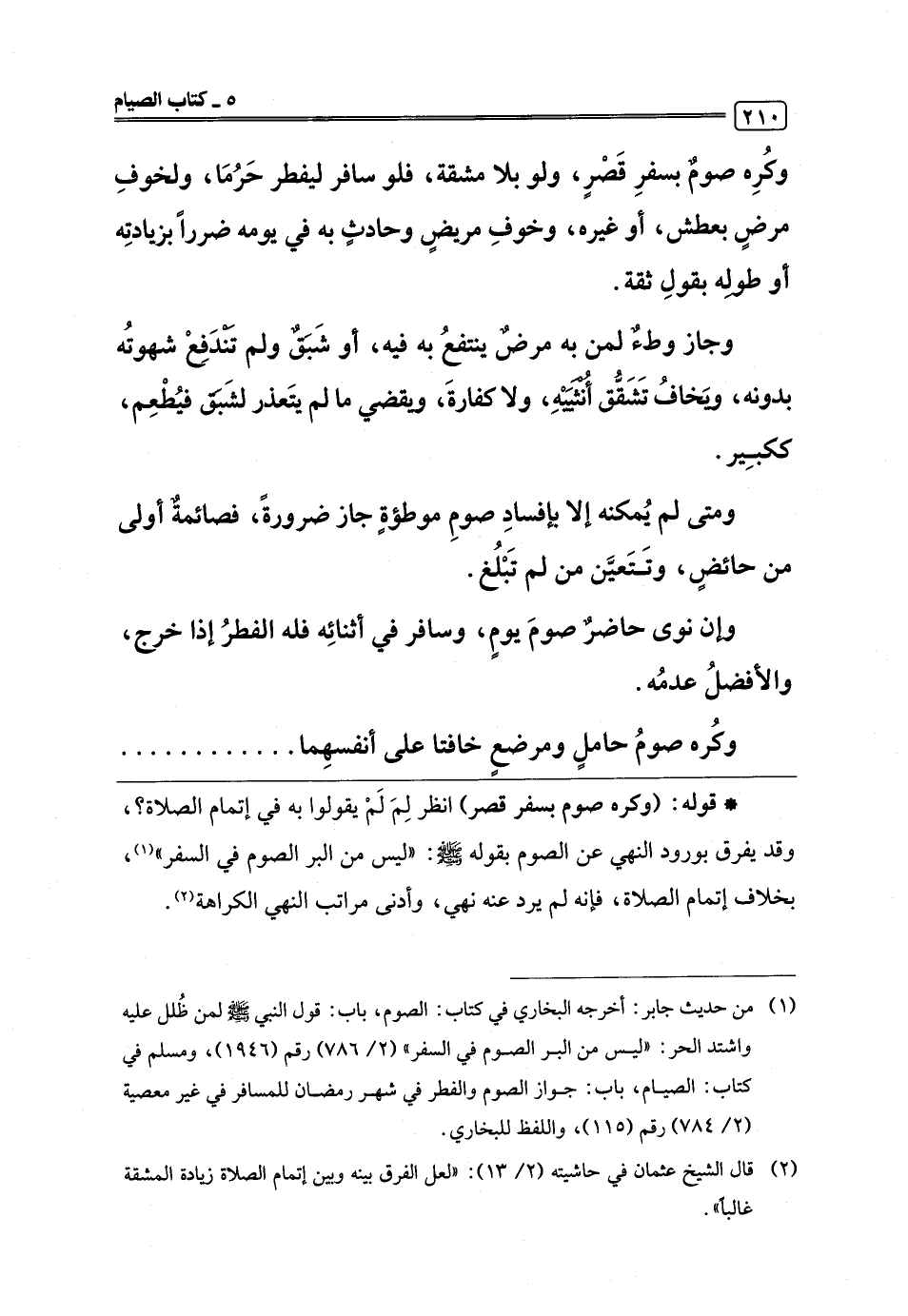 وكُرِه صومٌ بسفرِ قَصْرٍ، ولو بلا مشقة، فلو سافر ليفطر حَرُمَا، ولخوفِ مرضٍ بعطش، أو غيره، وخوفِ مريضٍ وحادثٍ به في يومه ضررًا بزيادتِه أو طولِه بقولِ ثقة.