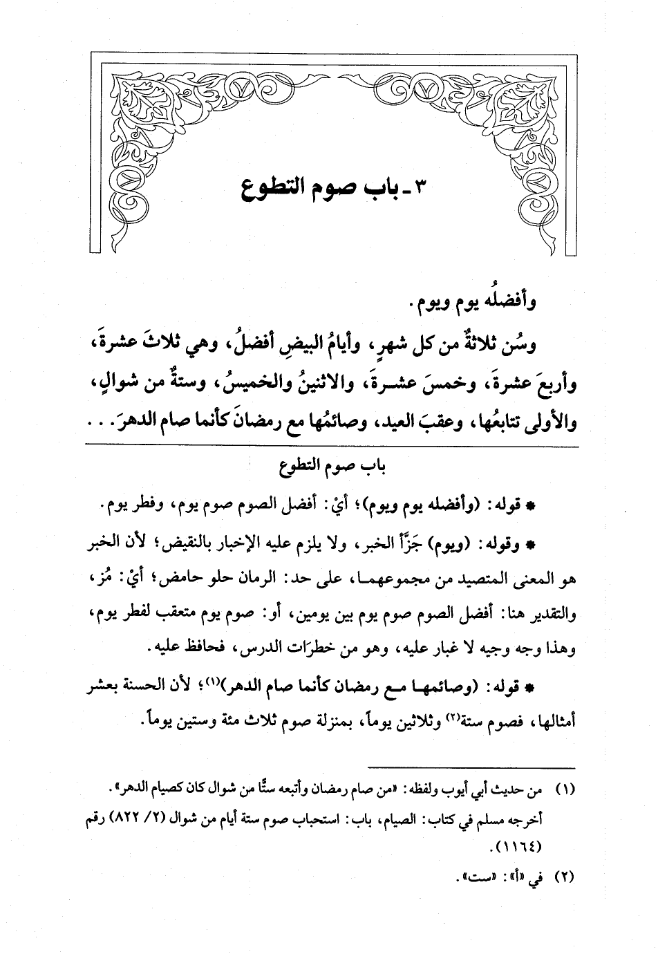 وسُن ثلاثةٌ من كل شهرٍ، وأيامُ البيضِ أفضلُ، وهي ثلاثَ عشرةَ، وأربعَ عشرةَ، وخمسَ عشرةَ، والاثنينُ والخميسُ، وستةٌ من شوالٍ، والأولى تتابعُها، وعقبَ العيد، وصائمُها مع رمضانَ كأنما صام الدهرَ. . . . . .