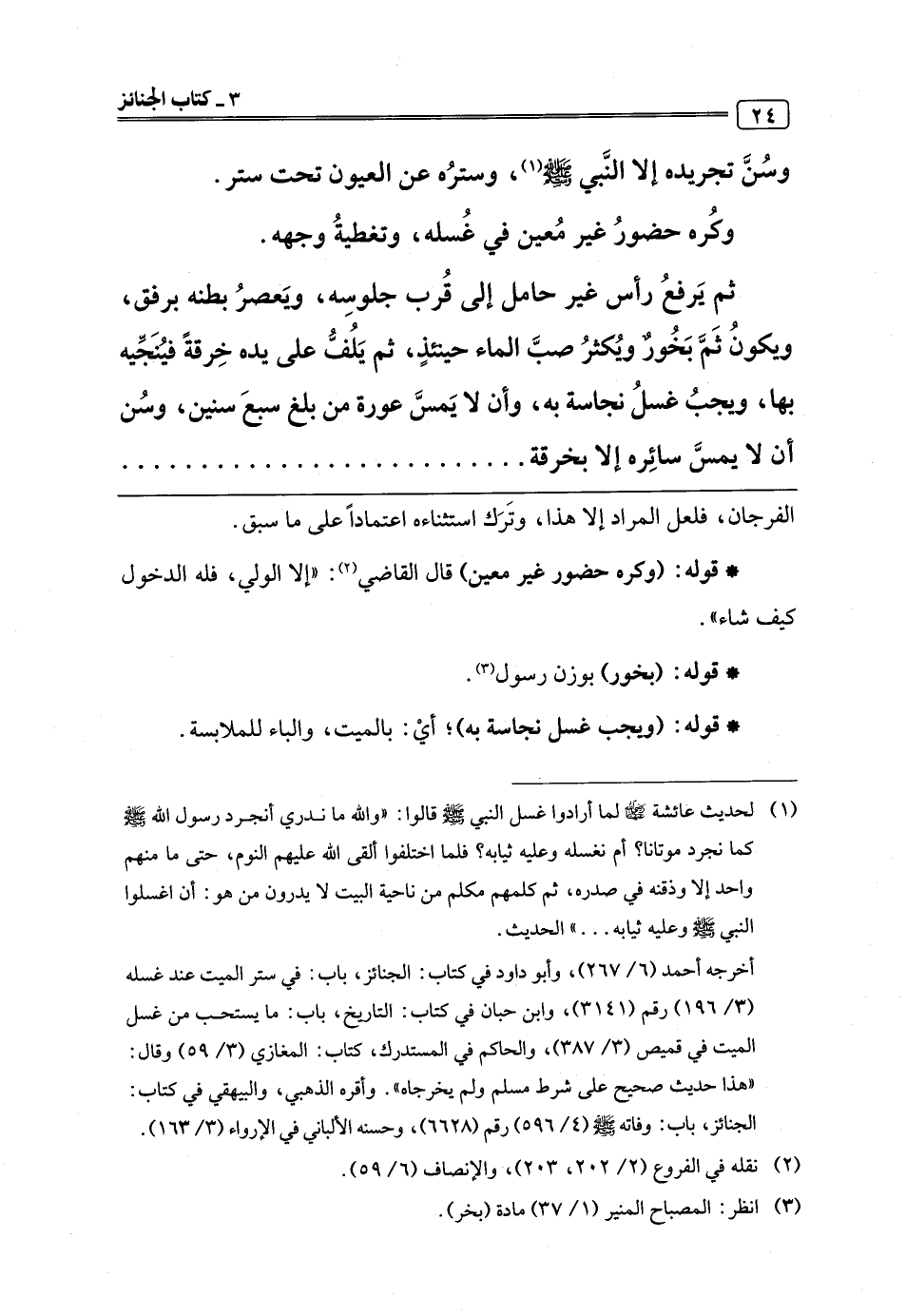 (¬1) لحديث عائشة -رضي اللَّه عنها- لما أرادوا غسل النبي -صلى اللَّه عليه وسلم- قالوا: "واللَّه ما ندري أنجرد رسول اللَّه -صلى اللَّه عليه وسلم- كما نجرد موتانا؟ أم نغسله وعليه ثيابه؟ فلما اختلفوا ألقى اللَّه عليهم النوم، حتى ما منهم واحد إلا وذقنه في صدره، ثم كلمهم مكلم من ناحية البيت لا يدرون من هو: أن اغسلوا النبي -صلى اللَّه عليه وسلم- وعليه ثيابه. . . " الحديث.