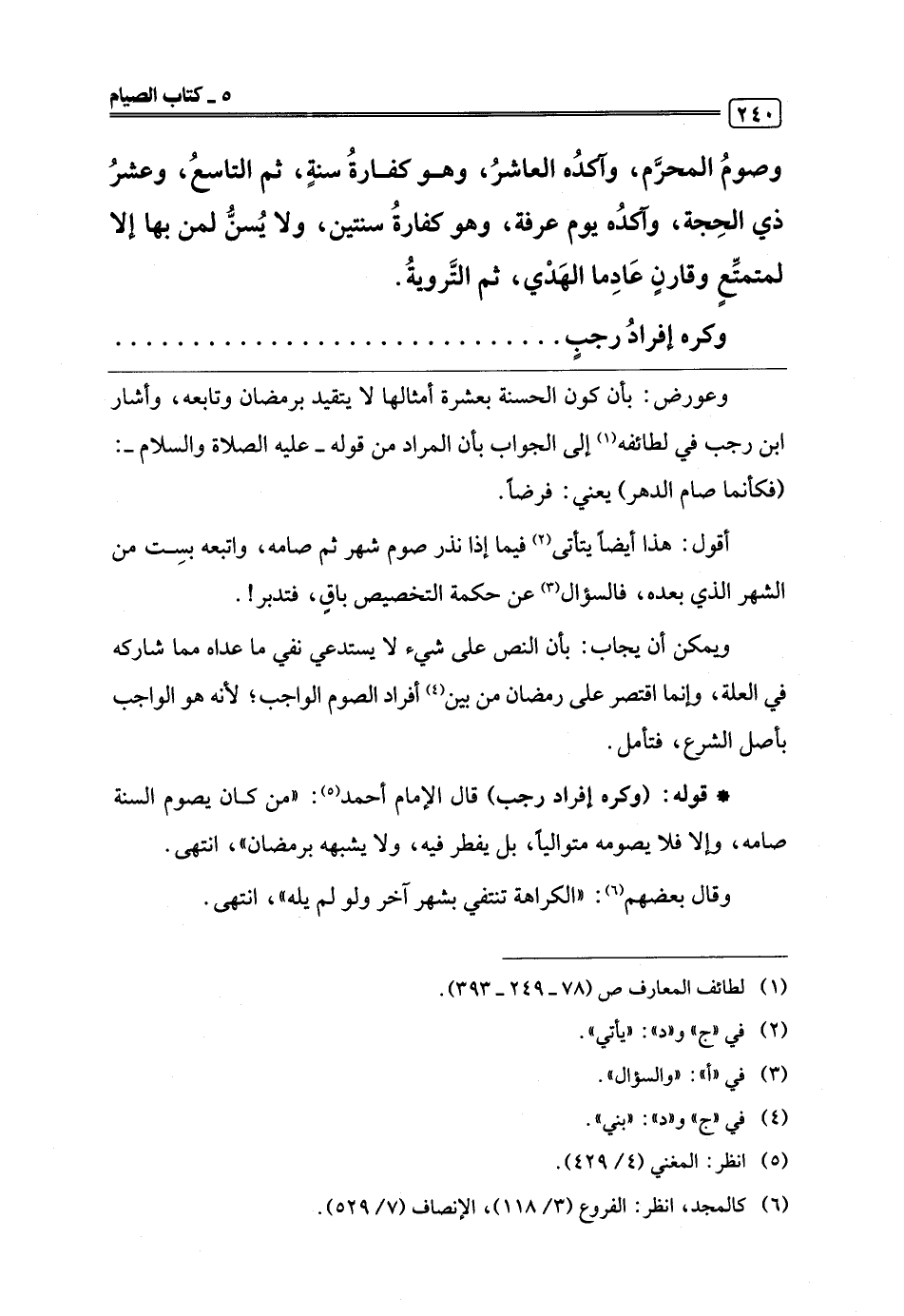 * قوله: (وكره إفراد رجب) قال الإمام أحمد (¬5): "من كان يصوم السنة صامه، وإلا فلا يصومه متواليًا، بل يفطر فيه، ولا يشبهه برمضان"، انتهى.