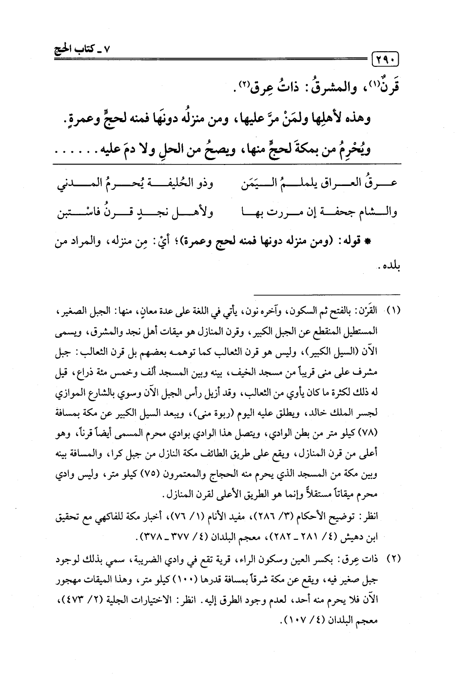 (¬2) ذات عِرق: بكسر العين وسكون الراء، قرية تقع في وادي الضريبة، سمي بذلك لوجود جبل صغير فيه، ويقع عن مكة شرقًا بمسافة قدرها (100) كيلو متر، وهذا الميقات مهجور الآن فلا يحرم منه أحد، لعدم وجود الطرق إليه. انظر: الاختيارات الجلية (2/ 473)، معجم البلدان (4/ 107).