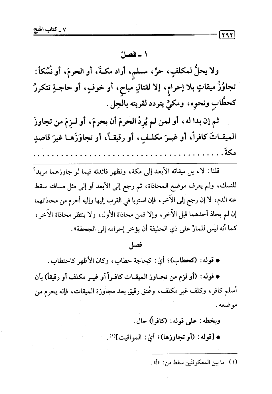 ولا يحلُّ لمكلفٍ، حرٍّ، مسلمٍ، أراد مكةَ، أو الحرمَ، أو نُسُكًا: تجاوُزُ ميقاتٍ بلا إحرامٍ، إلا لقتالٍ مباحٍ، أو خوفٍ، أو حاجةٍ تتكررُ كحطَّابٍ ونحوِه، ومكيٍّ يتردد لقريته بالحِل.
