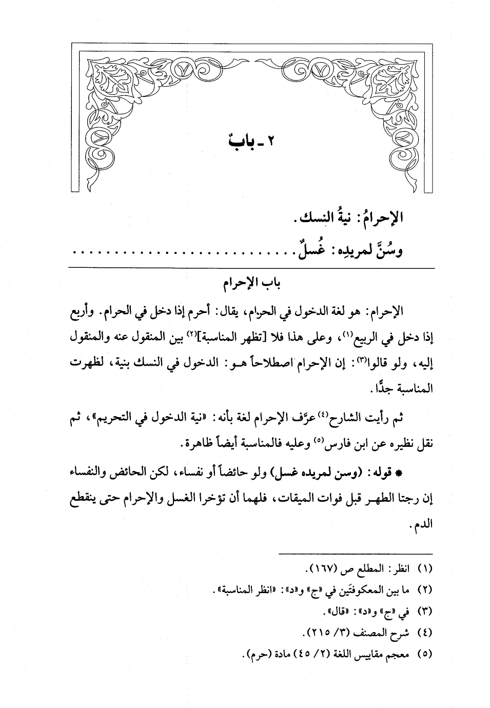 ثم رأيت الشارح (¬4) عرَّف الإحرام لغة بأنه: "نية الدخول في التحريم"، ثم نقل نظيره عن ابن فارس (¬5) وعليه فالمناسبة أيضًا ظاهرة.