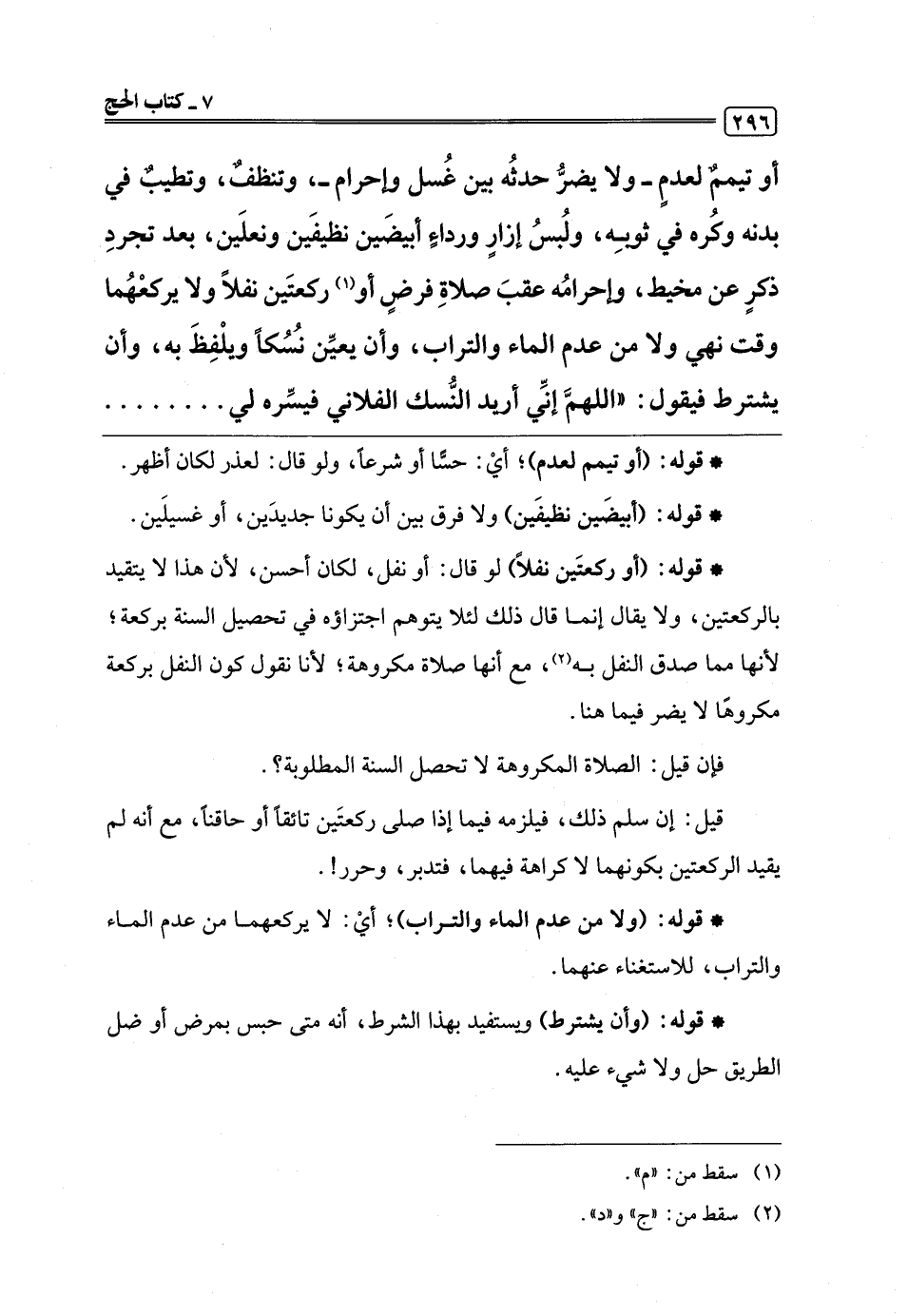 أو تيممٌ لعدمٍ -ولا يضرُّ حدثُه بين غُسل وإحرام-، وتنظفٌ، وتطيبٌ في بدنه وكُره في ثوبِه، ولُبسُ إزارٍ ورداءٍ أبيضَين نظيفَين ونعلَين، بعد تجردِ ذكرٍ عن مخيط، وإحرامُه عقبَ صلاةِ فرضٍ أو (¬1) ركعتَين نفلًا ولا يركعْهُما وقت نهي ولا من عدم الماء والتراب، وأن يعيِّن نُسُكًا ويلْفِظَ به، وأن يشترط فيقول: "اللَّهمَّ إنِّي أريد النُّسك الفلاني فيسِّره لي. . . . . .