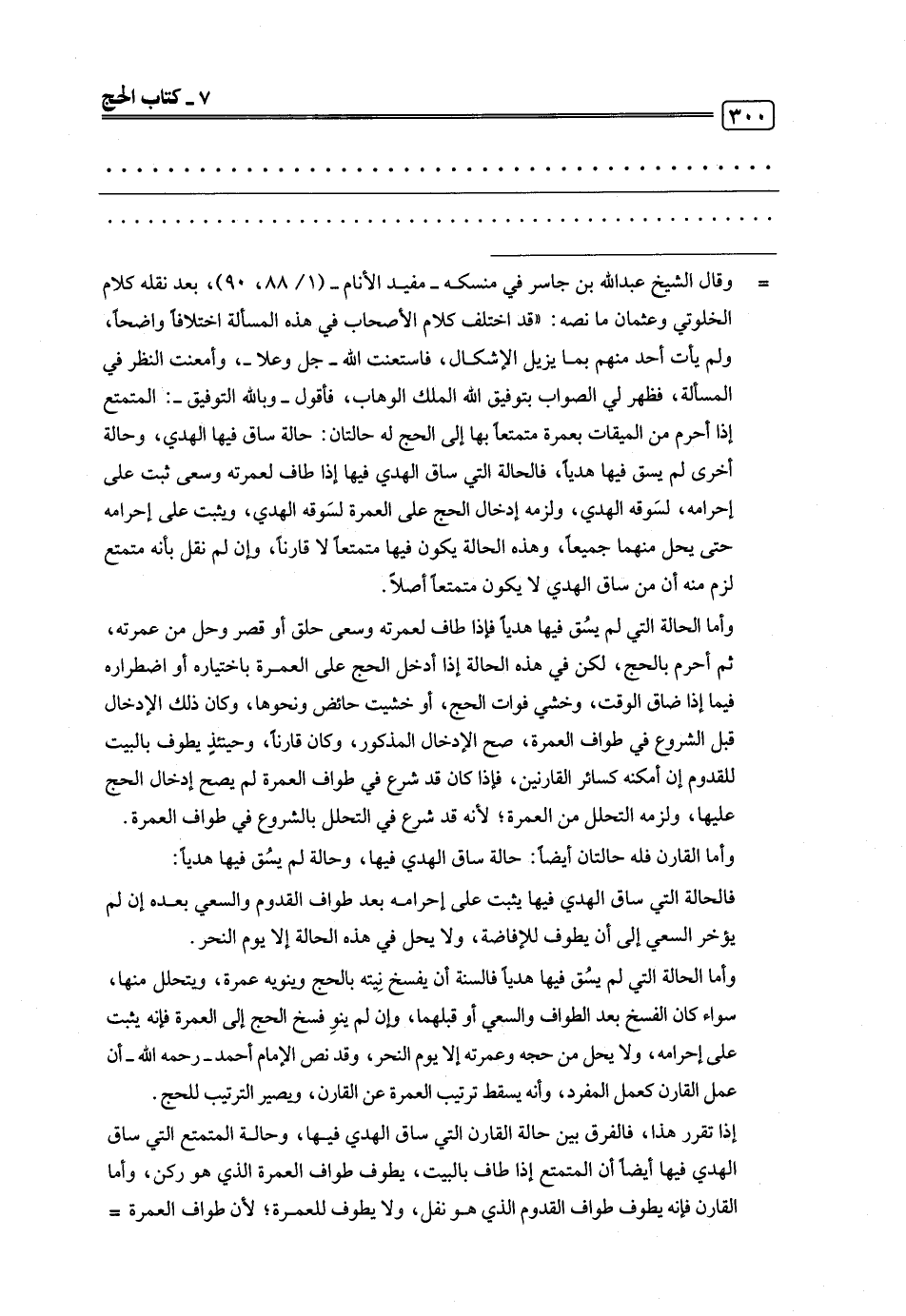 = وقال الشيخ عبد اللَّه بن جاسر في منسكه -مفيد الأنام- (1/ 88، 90)، بعد نقله كلام الخلوتي وعثمان ما نصه: "قد اختلف كلام الأصحاب في هذه المسألة اختلافًا واضحًا، ولم يأت أحد منهم بما يزيل الإشكال، فاستعنت اللَّه -جل وعلا-، وأمعنت النظر في المسألة، فظهر لي الصواب بتوفيق اللَّه الملك الوهاب، فأقول -وباللَّه التوفيق-: المتمتع إذا أحرم من الميقات بعمرة متمتعًا بها إلى الحج له حالتان: حالة ساق فيها الهدي، وحالة أخرى لم يسق فيها هديًا، فالحالة التي ساق الهدي فيها إذا طاف لعمرته وسعى ثبث على إحرامه، لسَوقه الهدي، ولزمه إدخال الحج على العمرة لسَوقه الهدي، ويثبت على إحرامه حتى يحل منهما جميعًا، وهذه الحالة يكون فيها متمتعًا لا قارنًا، وإن لم نقل بأنه متمتع لزم منه أن من ساق الهدي لا يكون متمتعًا أصلًا.
