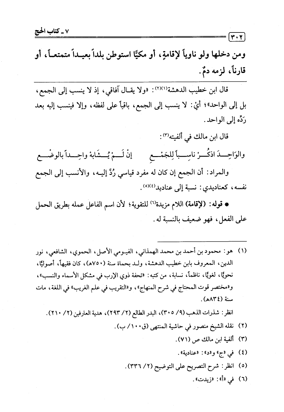 (¬1) هو: محمود بن أحمد بن محمد الهمذاني، الفيومي الأصل، الحموي، الشافعي، نور الدين، المعروف بابن خطيب الدهشة، ولد بحماة سنة (750 هـ)، كان فقيهًا، أصوليًّا، نحويًّا، لغويًّا، ناظمًا، نسابة، من كتبه: "تحفة ذوي الإرب في مشكل الأسماء والنسب"، و"مختصر قوت المحتاج في شرح المنهاج"، و"التقريب في علم الغريب" في اللغة، مات سنة (834 هـ).