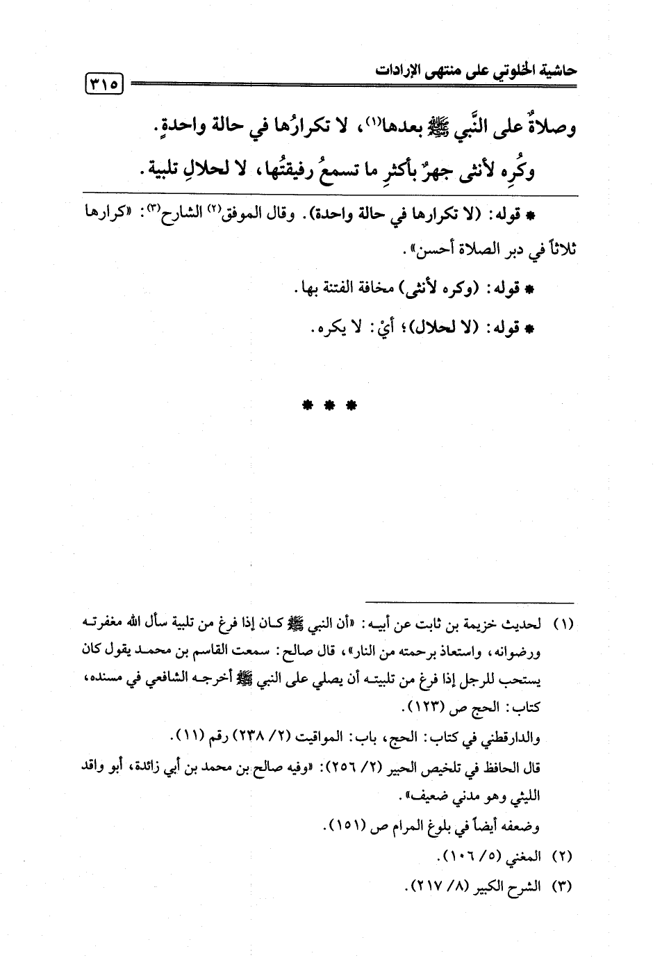 (¬1) لحديث خزيمة بن ثابت عن أبيه: "أن النبي -صلى اللَّه عليه وسلم- كان إذا فرغ من تلبية سأل اللَّه مغفرته ورضوانه، واستعاذ برحمته من النار"، قال صالح: سمعت القاسم بن محمد يقول كان يستحب للرجل إذا فرغ من تلبيته أن يصلِّي على النبي -صلى اللَّه عليه وسلم- أخرجه الشافعي في مسنده، كتاب: الحج ص (123).