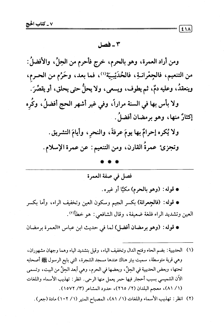 * قوله: (فالجعرانة) بكسر الجيم وسكون العين وتخفيف الراء، وأما بكسر العين وتشديد الراء فلغة ضعيفة، وقال الشافعي: هو خطأ (¬2).