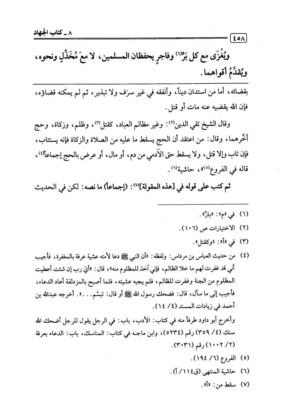 وقال الشيخ تقي الدين (¬2): وغير مظالم العباد، كقتل (¬3)، وظلم، وزكاة، وحج أخَّرهما، وقال: من اعتقد أن الحج يسقط ما عليه من الصلاة والزكاة فإنه يستتاب، فإن تاب وإلا قتل، ولا يسقط حق الآدمي من دم، أو مال، أو عرض بالحج إجماعًا (¬4)، قاله في الفروع (¬5) "، حاشية (¬6).
