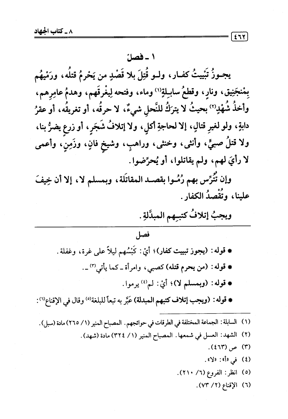 يجوزُ تَبْييتُ كفار، ولو قُتِلَ بلا قَصْدٍ من يَحْرمُ قتلُه، ورَمْيهُم بِمْنجَنِيق، ونارٍ، وقطعُ سابِلةٍ (¬1) وماء، وفتحه لِيغْرقَهم، وهدمُ عامِرِهم، وأخذُ شُهْدٍ (¬2) بحيثُ لا يترَكُ للنَّحلِ شيءٌ, لا حرقُه، أو تغريقُه، أو عقرُ دابةٍ، ولو لغيرِ قتالٍ، إلا لحاجةِ أكلٍ، ولا إتلافُ شَجَرٍ، أو زرعٍ يضرُّ بنا، ولا قتلُ صبيٍّ، وأنثى، وخنثى، وراهبٍ، وشيخٍ فانٍ، وزَمِنٍ، وأعمى لا رأيَ لهم، ولم يقاتلوا، أو يُحرِّضوا.