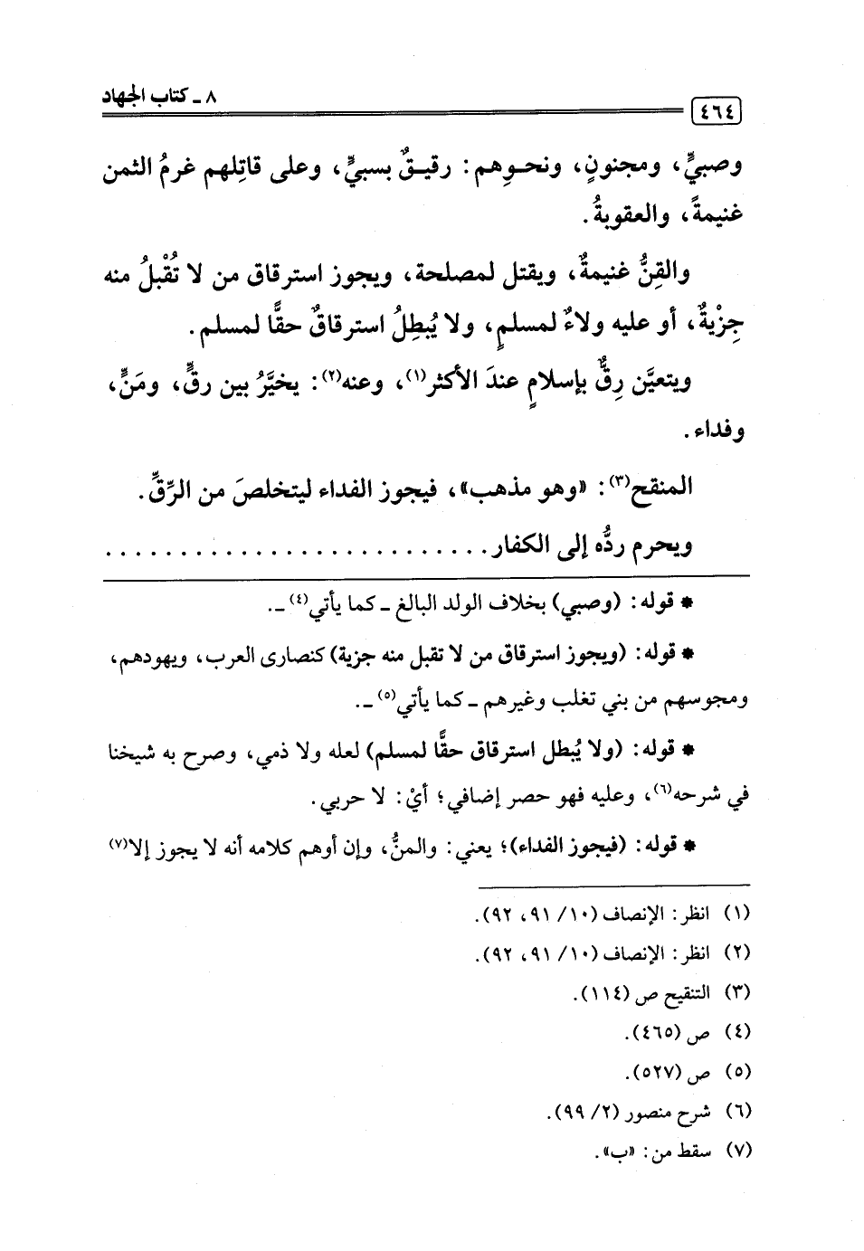 والقِنُّ غنيمةٌ، ويقتل لمصلحة، ويجوز استرقاق من لا تُقْبلُ منه جِزْيةٌ، أو عليه ولاءٌ لمسلمٍ، ولا يُبطِلُ استرقاقٌ حقًّا لمسلم.