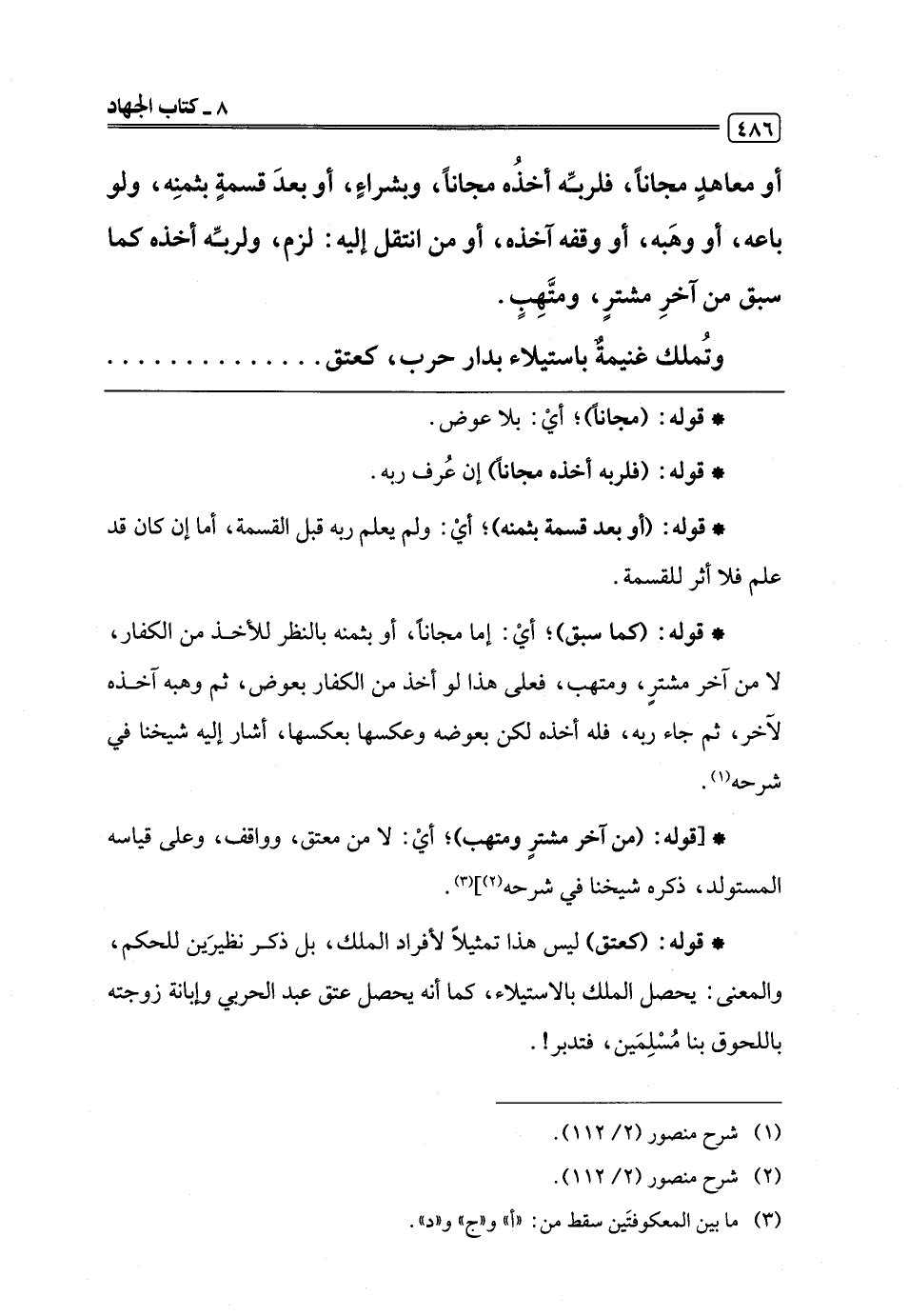 * قوله: (كما سبق)؛ أيْ: إما مجانًا، أو بثمنه بالنظر للأخذ من الكفار، لا من آخر مشترٍ، ومتهب، فعلى هذا لو أخذ من الكفار بعوض، ثم وهبه آخذه لآخر، ثم جاء ربه، فله أخذه لكن بعوضه وعكسها بعكسها، أشار إليه شيخنا في شرحه (¬1).