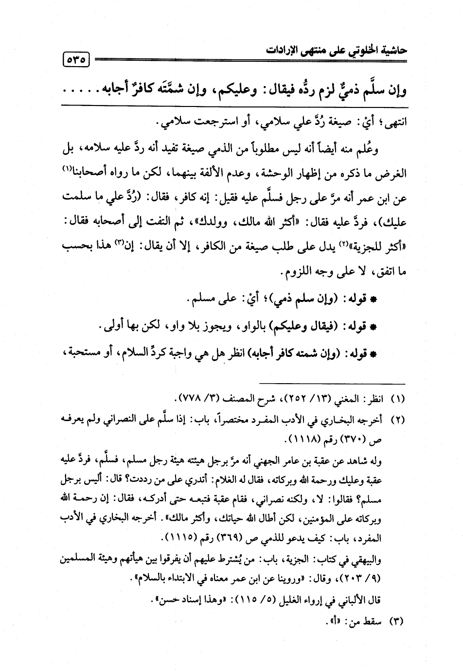 وعُلم منه أيضًا أنه ليس مطلوبًا من الذمي صيغة تفيد أنه ردَّ عليه سلامه، بل الغرض ما ذكره من إظهار الوحشة، وعدم الألفة بينهما، لكن ما رواه أصحابنا (¬1) عن ابن عمر أنه مرَّ على رجل فسلَّم عليه فقيل: إنه كافر، فقال: (رُدَّ علي ما سلمت عليك)، فردَّ عليه فقال: "أكثر اللَّه مالك، وولدك"، ثم التفت إلى أصحابه فقال: "أكثر للجزية" (¬2) يدل على طلب صيغة من الكافر، إلا أن يقال: إن (¬3) هذا بحسب ما اتفق، لا على وجه اللزوم.