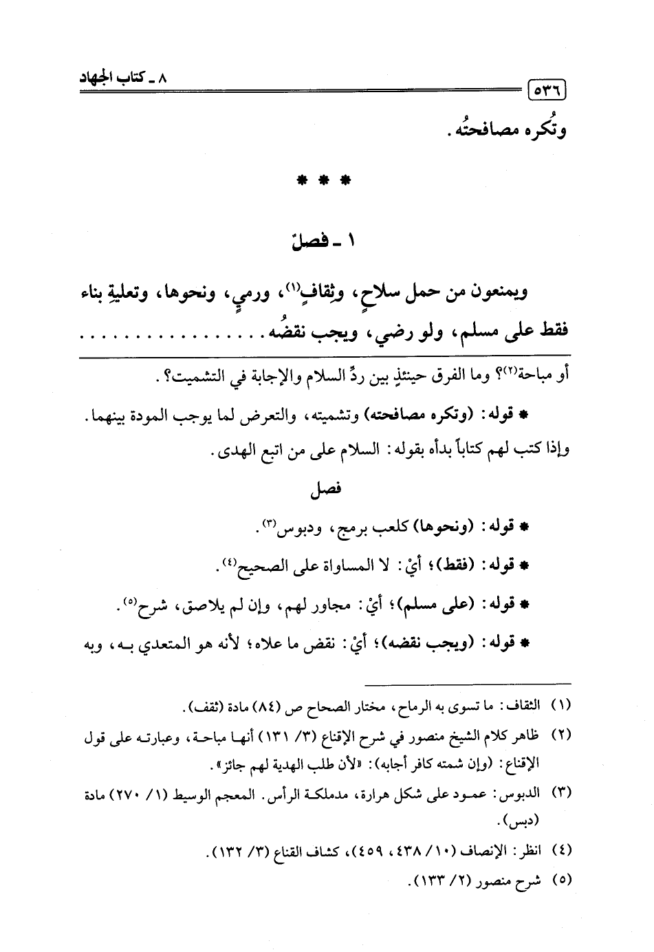 * قوله: (وتكره مصافحته) وتشميته، والتعرض لما يوجب المودة بينهما. وإذا كتب لهم كتابًا بدأه بقوله: السلام على من اتبع الهدى.