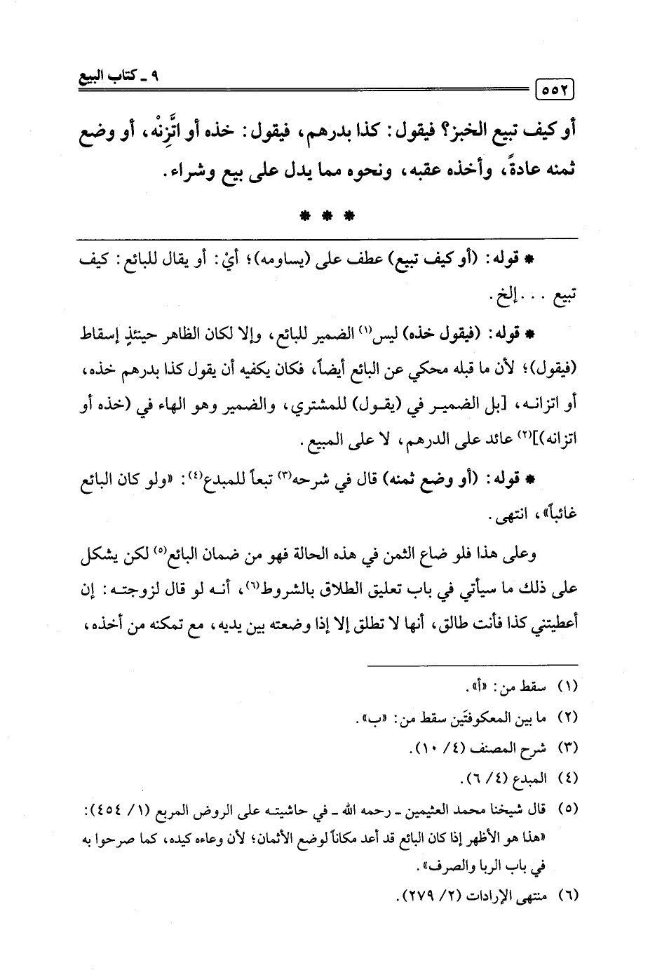 (¬5) قال شيخنا محمد العثيمين -رحمه اللَّه- في حاشيته على الروض المربع (1/ 454): "هذا هو الأظهر إذا كان البائع قد أعد مكانًا لوضع الأثمان؛ لأن وعاءه كيده، كما صرحوا به في باب الربا والصرف".