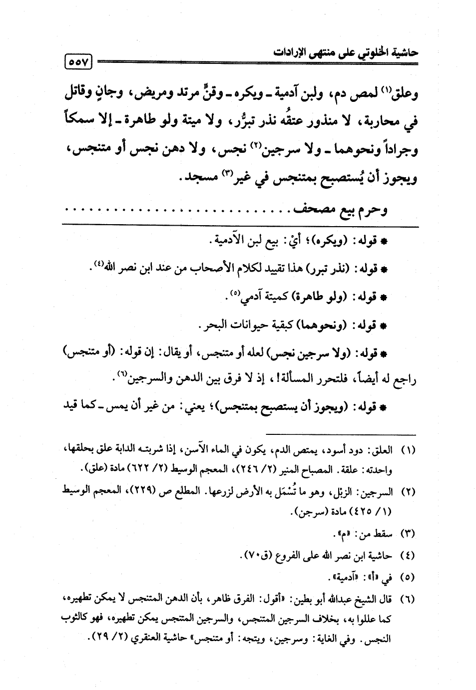(¬6) قال الشيخ عبد اللَّه أبو بطين: "أقول: الفرق ظاهر، بأن الدهن المتنجس لا يمكن تطهيره، كما عللوا به، بخلاف السرجين المتنجس، والسرجين المتنجس يمكن تطهيره، فهو كالثوب النجس. وفي الغاية: وسرجين، ويتجه: أو متنجس" حاشية العنقري (2/ 29).
