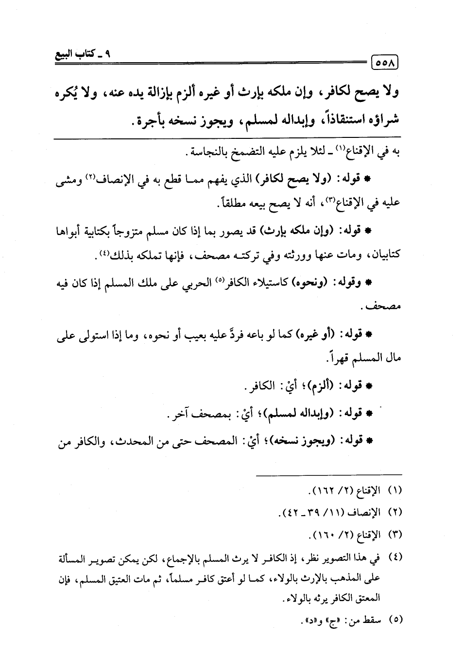 * قوله: (وإن ملكه بإرث) قد يصور بما إذا كان مسلم متزوجًا بكتابية أبواها كتابيان، ومات عنها وورثته وفي تركته مصحف، فإنها تملكه بذلك (¬4).
