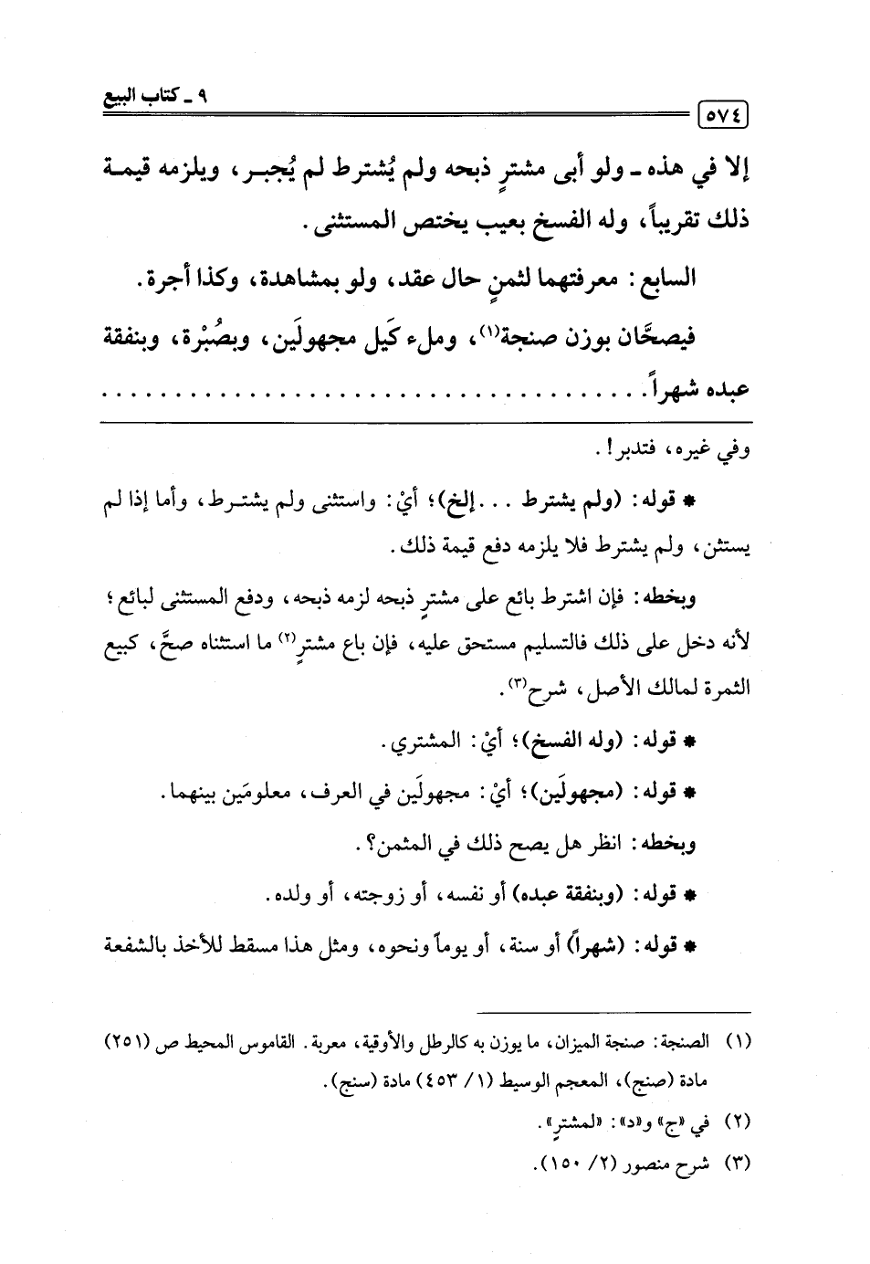 وبخطه: فإن اشترط بائع على مشترٍ ذبحه لزمه ذبحه، ودفع المستثنى لبائع؛ لأنه دخل على ذلك فالتسليم مستحق عليه، فإن باع مشترٍ (¬2) ما استثناه صحَّ، كبيع الثمرة لمالك الأصل، شرح (¬3).