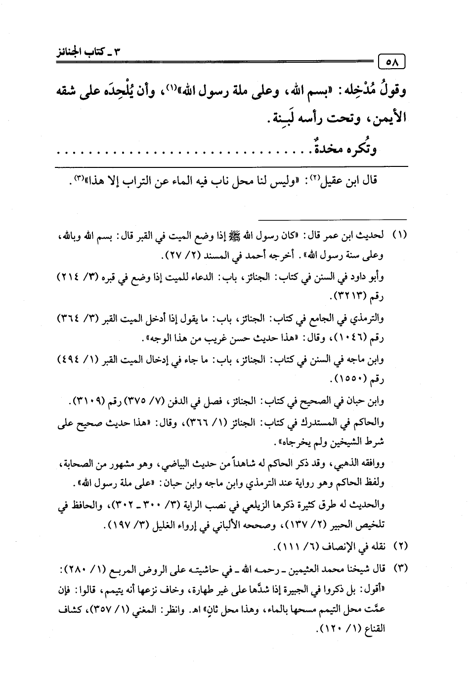 (¬3) قال شيخنا محمد العثيمين -رحمه اللَّه- في حاشيته على الروض المربع (1/ 280): "أقول: بل ذكروا في الجبيرة إذا شدَّها على غير طهارة، وخاف نزعها أنه يتيمم، قالوا: فإن عمَّت محل التيمم مسحها بالماء، وهذا محل ثانٍ" اهـ. وانظر: المغني (1/ 357)، كشاف القناع (1/ 120).
