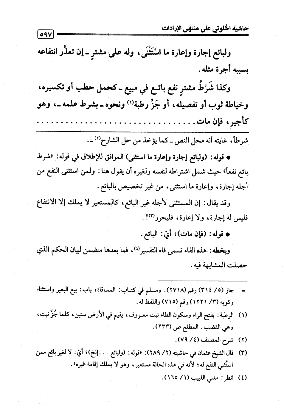 (¬3) قال الشيخ عثمان في حاشيته (2/ 289): "قوله: (ولبائع. . . إلخ)؛ أيْ: لا لغير بائع ممن استُثني النفع له؛ لأنه في هذه الحالة مستعير، وهو لا يملك إقامة غيره".