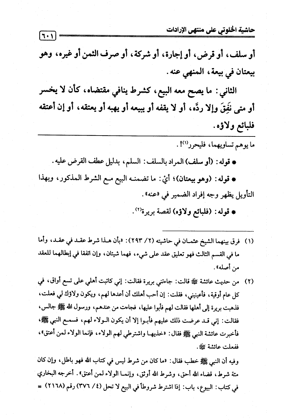 وفيه أن النبي -صلى اللَّه عليه وسلم- خطب فقال: "ما كان من شرط ليس في كتاب اللَّه فهو باطل، وإن كان مئة شرط، قضاء اللَّه أحق، وشرط اللَّه أوثق، وإنما الولاء لمن أعتق". أخرجه البخاري في كتاب: البيوع، باب: إذا اشترط شروطًا في البيع لا تحل (4/ 376) رقم (2168) =