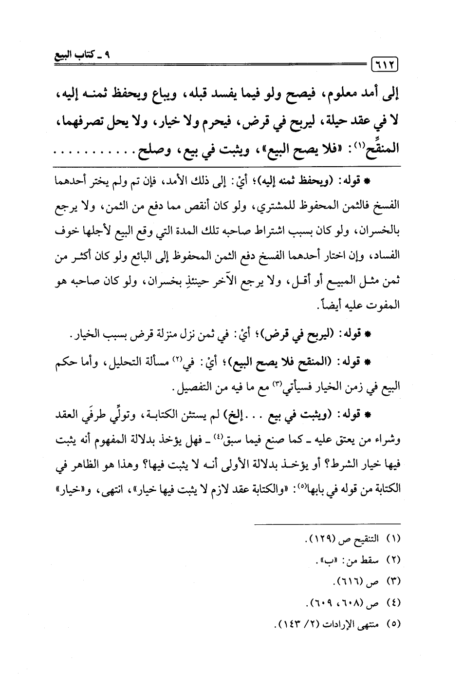 إلى أمد معلوم، فيصح ولو فيما يفسد قبله، ويباع ويحفظ ثمنه إليه، لا في عقد حيلة، ليربح في فرض، فيحرم ولا خيار، ولا يحل تصرفهما، المنقِّح (¬1): "فلا يصح البيع" ويثبت في بيع، وصلح. . . . . .