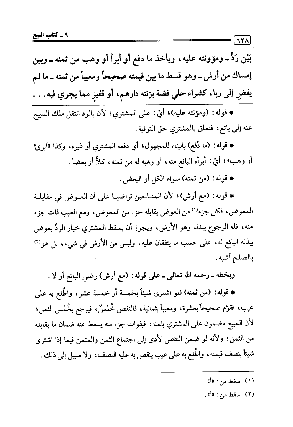 بَيْن رَدٍّ- ومؤونته عليه، ويأخذ ما دفع أو أبرأ أو وهب من ثمنه -وبين إمساك من أرش- وهو قسط ما بين قيمته صحيحًا ومعيبًا من ثمنه -ما لم يفضِ إلى ربا، كشراء حلي فضة بزنته دارهم، أو قفيزٍ مما يجري فيه. . . . . .