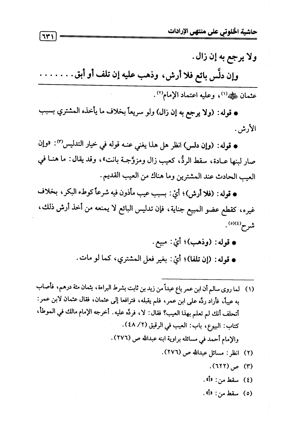 (¬1) لما روى سالم أن ابن عمر باع عبدًا من زيد بن ثابت بشرط البراءة، بثمان مئة درهم، فأصاب به عيبًا، فأراد ردَّه على ابن عمر، فلم يقبله، فترافعا إلى عثمان، فقال عثمان لابن عمر: أتحلف أنك لم تعلم بهذا العيب؟ فقال: لا، فردَّه عليه. أخرجه الإمام مالك في الموطأ، كتاب: البيوع، باب: العيب في الرقيق (2/ 48).