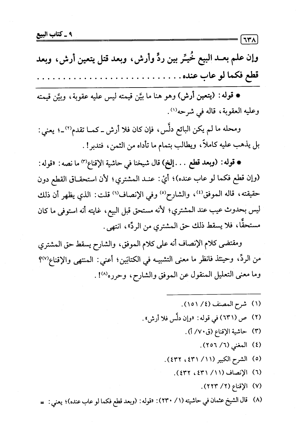 ومقتضى كلام الإنصاف أنه على كلام الموفق، والشارح يسقط حق المشتري من الردِّ، وحينئذ فانظر ما معنى التشبيه في الكتابَين؛ أعني: المنتهى والإقناع (¬7)؟ وما معنى التعليل المنقول عن الموفق والشارح، وحرره (¬8)!.