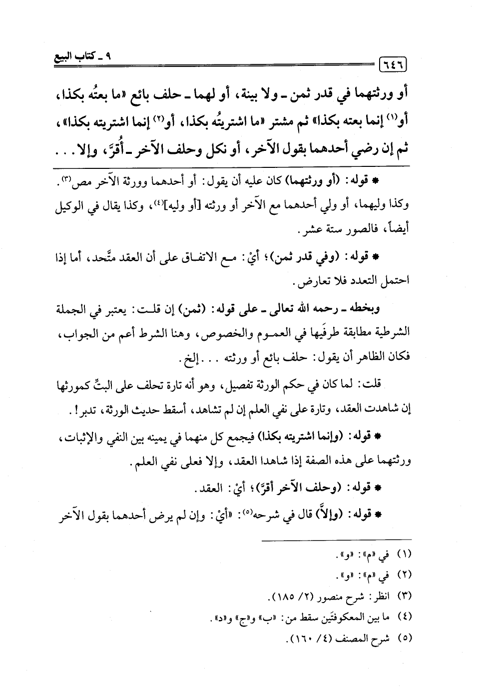 وبخطه -رحمه اللَّه تعالى- على قوله: (ثمن) إن قلت: يعتبر في الجملة الشرطية مطابقة طرفَيها في العموم والخصوص، وهنا الشرط أعم من الجواب، فكان الظاهر أن يقول: حلف بائع أو ورثته. . . إلخ.
