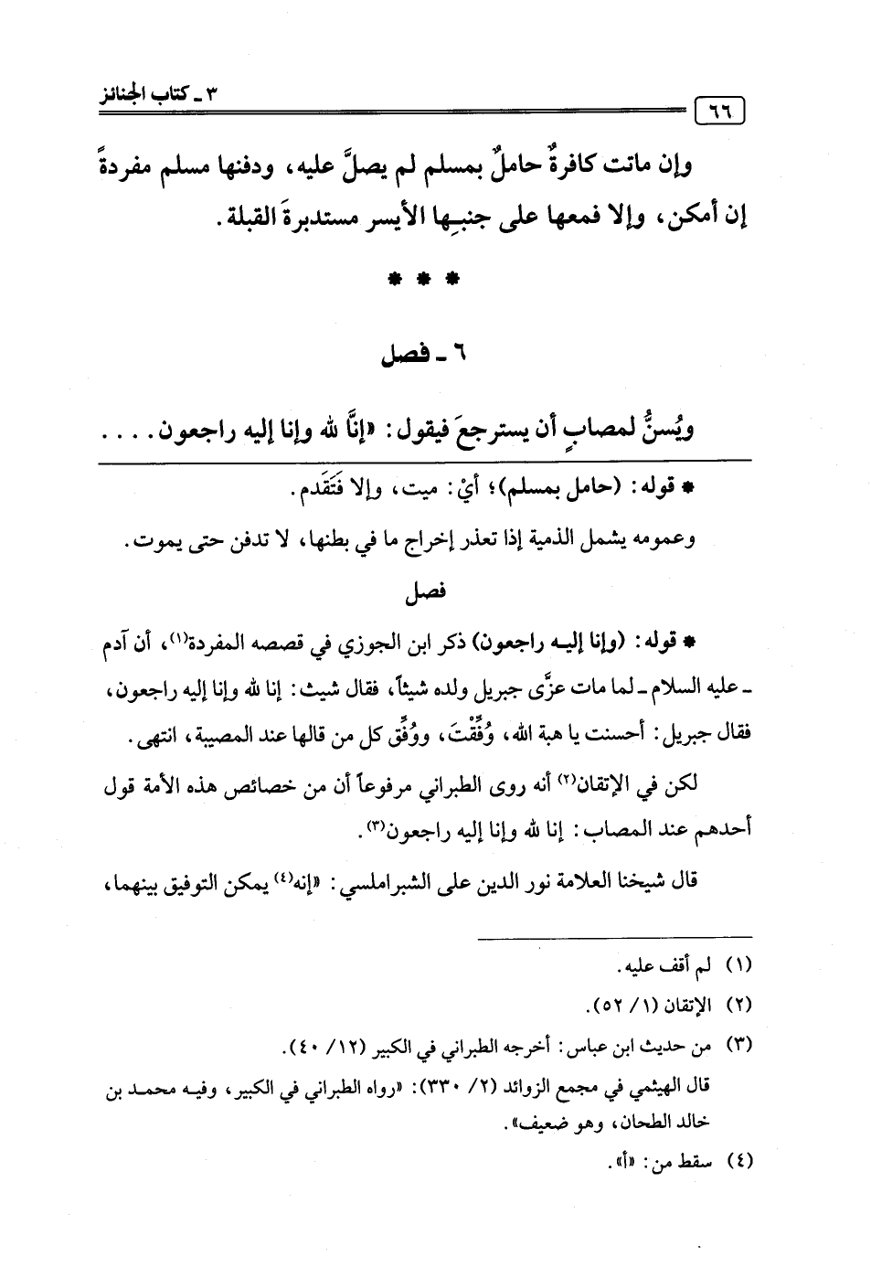 ويُسنُّ لمصابٍ أن يسترجعَ فيقول: "إنَّا للَّه وإنا إليه راجعون. . . . . .