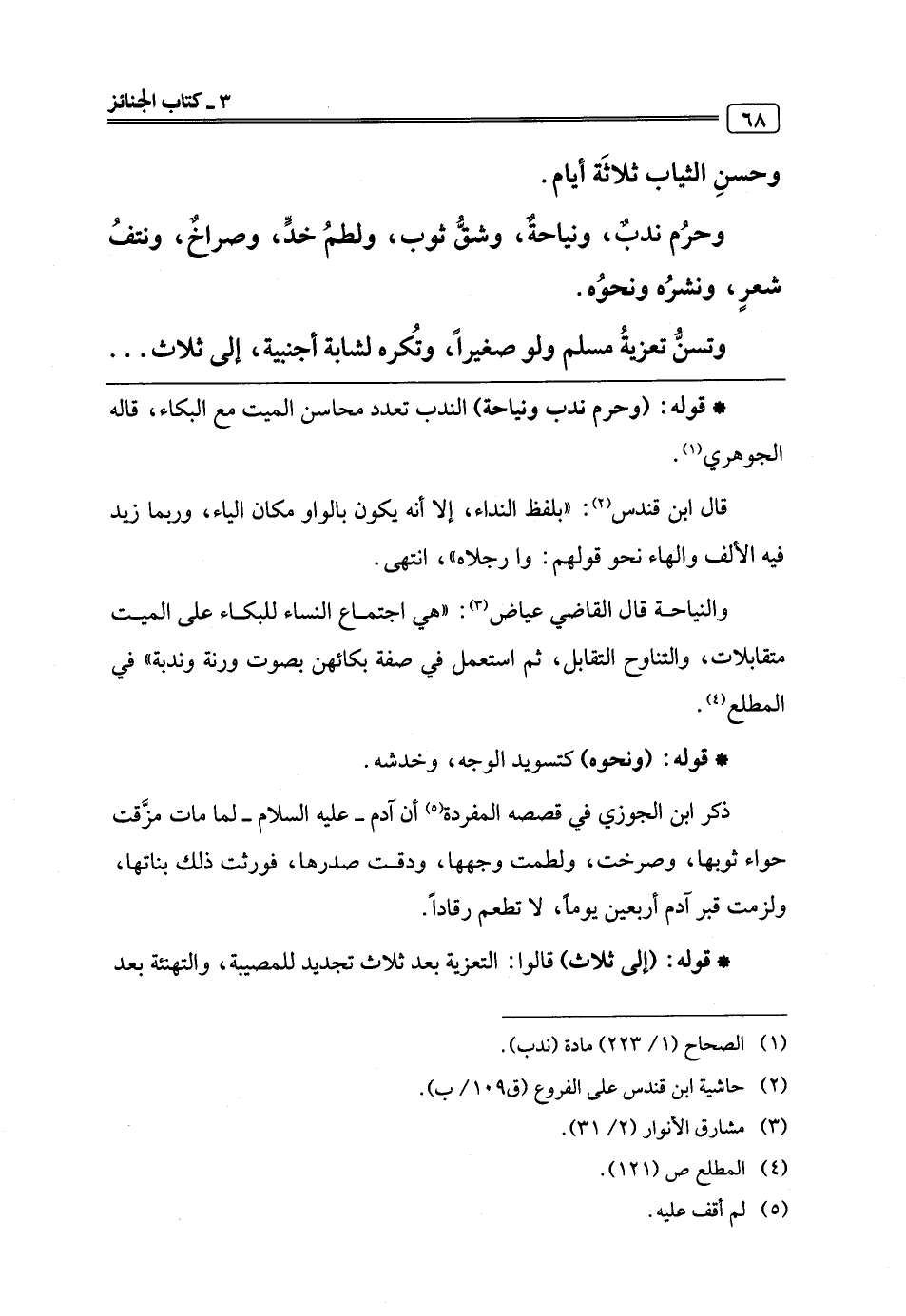 والنياحة قال القاضي عياض (¬3): "هي اجتماع النساء للبكاء على الميت متقابلات، والتناوح التقابل، ثم استعمل في صفة بكائهن بصوت ورنة وندبة" في المطلع (¬4).