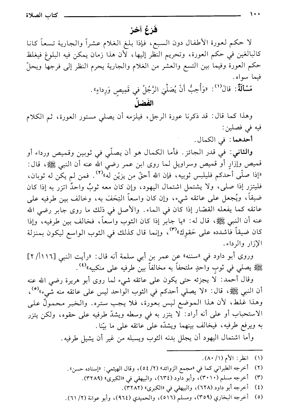 والثاني: في قدر الجائز. فأما الكمال هو أن يصلي في ثوبين وقميص ورداء أو قميص وإزار أو قميص وسراويل لما روى ابن عمر رضي الله عنه أن النبي - صلى الله عليه وسلم -، قال: "إذا صلى أحدكم فليلبس ثوبيه، فإن الله أحقّ من يزين له". فمن لم يكن له ثوبان، فليتزر إذا صلى، ولا يشتمل اشتمال اليهود، وإن كان معه ثوب واحد اتزر به إذا كان ضيقًا، ويجعل على عاتقه شيء، وإن كان واسعًا التحف به، وخالف بين طرفيه على عاتقه كما يفعله القصّار إذا كان في الماء. والأصل في ذلك ما روى جابر رضي الله عنه أن النبي - صلى الله عليه وسلم -، قال له: "يا جابر إذا كان الثوب واسعًا، فخالف بين طرفيه، وإذا كان ضيقًا فاشدده على حقوك"، وإنما قال كذلك في الثوب الواسع ليكون بمنزلة الإزار والرداء.