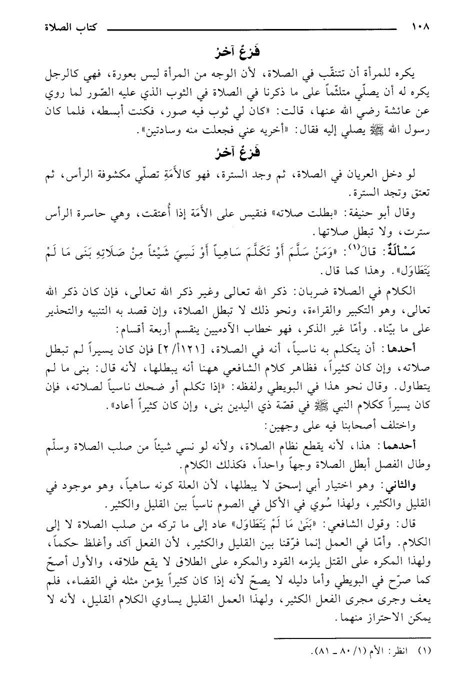 قال: وقول الشافعي: "بنى ما لم يتطاول" عاد إلى ما تركه من صلب الصلاة لا إلى الكلام. وأما في العمل إنما فرقنا بين القليل والكثير، لأن الفعل أكد وأغلظ حكماً، ولهذا المكره على القتل يلزمه القود والمكره على الطلاق لا يقع طلاقه، والأول أصح كما صرح في البويطي وأما دليله لا يصح لأنه إذا كان كثيراً يؤمن مثله في القضاء، فلم يعف وجرى مجرى الفعل الكثير، ولهذا العمل القليل يساوي الكلام القليل، لأنه لا يمكن الاحتراز منهما.
