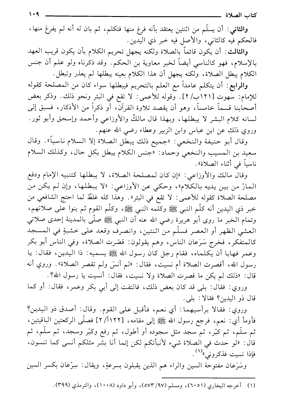 وقال مالك والأوزاعي: "إن كان لمصلحة الصلاة، لا يبطلها كتنبيه الإمام ودفع المار من بين يديه بالكلام"، وحكي عن الأوزاعي: "لا يبطلها، وان لم يكن هن مصلحة الصلاة كقوله للأعمى: لا تقع في البئر". وهذا كله غلط لما احتج الشافعي من خبر ذي اليدين أنه كلم النبي - صلى الله عليه وسلم - وكلمه النبي - صلى الله عليه وسلم -، وكلم القوم ثم بنوا على صلاتهم، وتمام الخبر ما روى أبو هريرة رضي الله عنه أن النبي - صلى الله عليه وسلم - صلى بالمدينة إحدى صلاتي العشي الظهر أو العصر فسلم من اثنتين، وانصرف وقعد على خشبة في المسجد كالمتفكر، فخرج سرعان الناس، وهم يقولون: قصرت الصلاة، وفي الناس أبو بكر وعمر فهابا أن يكلماه، فقام رجل كان رسول الله - صلى الله عليه وسلم - يسميه: ذا اليدين، فقال: يا رسول الله، أقصرت الصلاة أم نسيت، فقال: "لم أنس ولم تقصر الصلاة ". وروي أنه قال: "ذلك لم يكن ما قصرت الصلاة ولا نسيت، فقال: أنسيت يا وسول الله؟.
