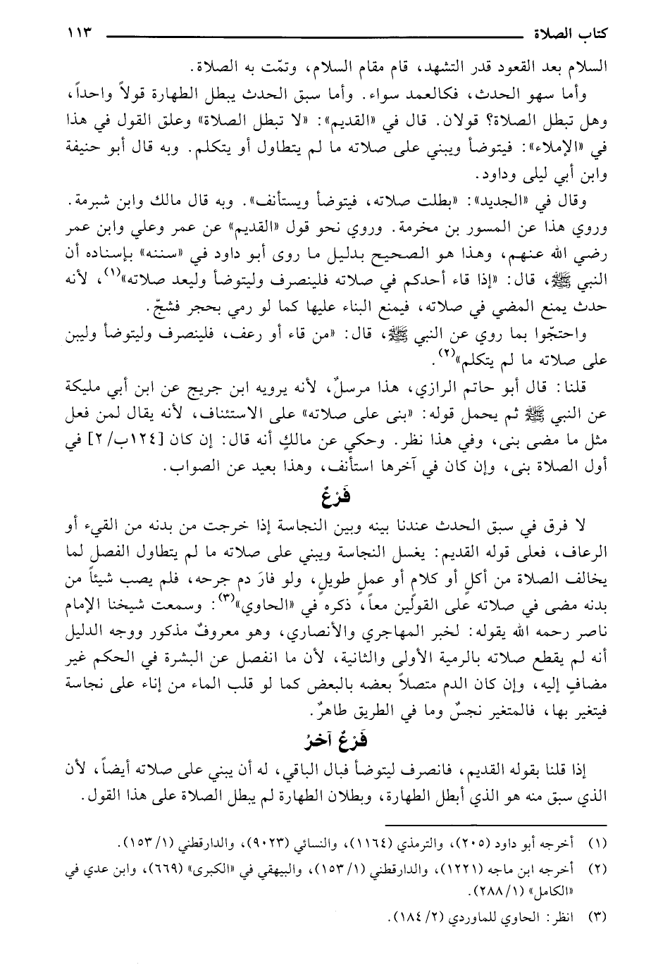 قلنا: قال أبو حاتم الرازي، هذا مرسل، لأنه يرويه ابن جريج عن ابن أبي مليكة عن النبي - صلى الله عليه وسلم - ثم يحمل قوله: "بنى على صلاته" على الاستئناف، لأنه يقال لمن فعل مثل ما مضى بنى، وفي هذا نظر. وحكي عن مالك أنه قال: إن كان [124 ب / 2] في أول الصلاة بنى، وإن كان في آخرها استأنف، وهذا بعيد عن الصواب.