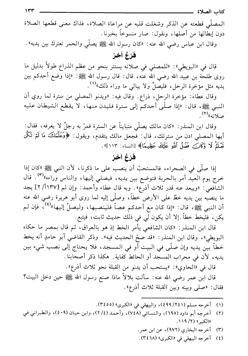 وقال ابن المنذر: "كان مالك يصلي متبايناً عن السترة فمر به رجل لا يعرفه، فقال: أيها المصلي ادن من سترتك، قال: فجعل مالك يتقدم، ويقول: {وَعَلَّمَكَ مَا لَمْ تَكُنْ تَعْلَمُ وَكَانَ فَضْلُ اللَّهِ عَلَيْكَ عَظِيماً} [النساء: 113] ".