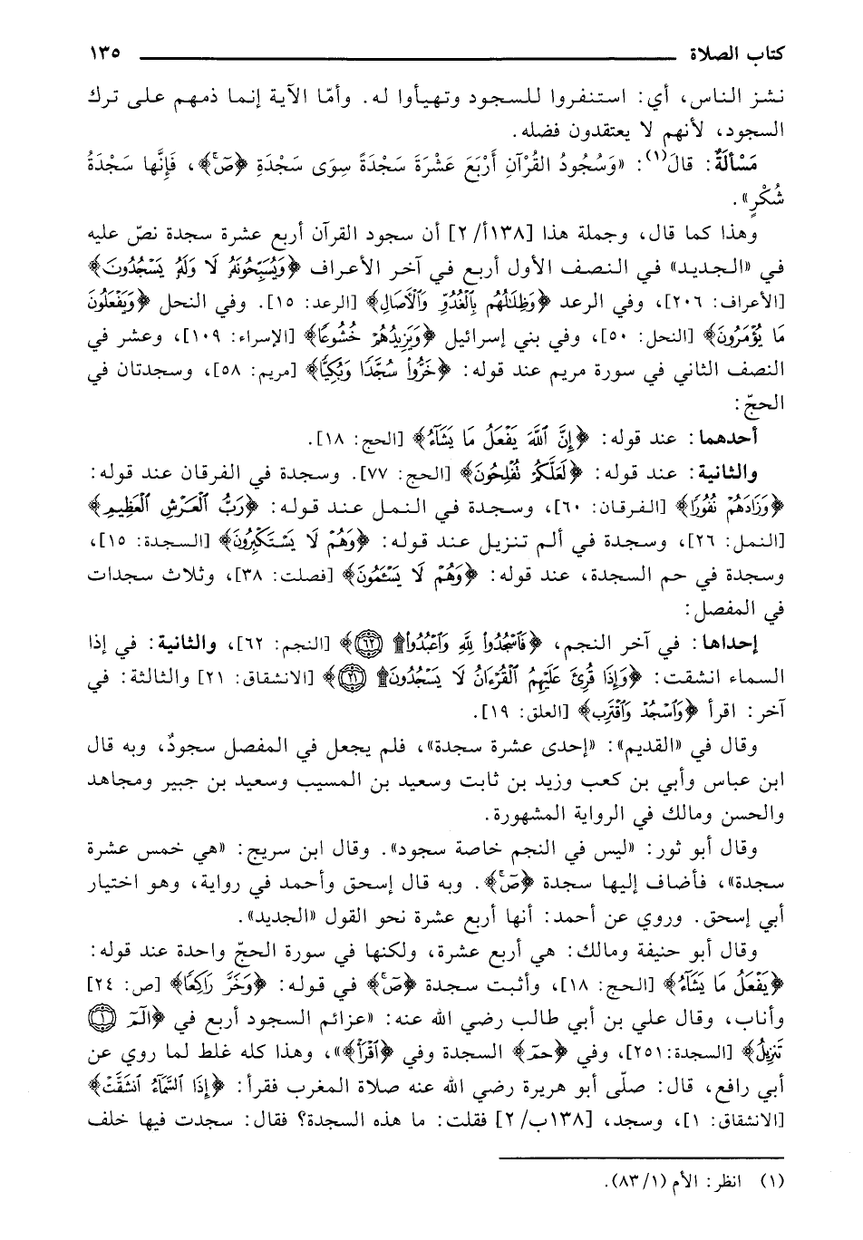 وقال أبو ثور: "ليس في النجم خاصة سجود". وقال ابن سريج: "هي خمس عشرة سجدة"، فأضاف إليها سجدة {ص}. وبه قال اسحق وأحمد في رواية، وهو اختيار أبي اسحق. وروي عن أحمد: أنها أربع عشرة نحو القول "الجديد".