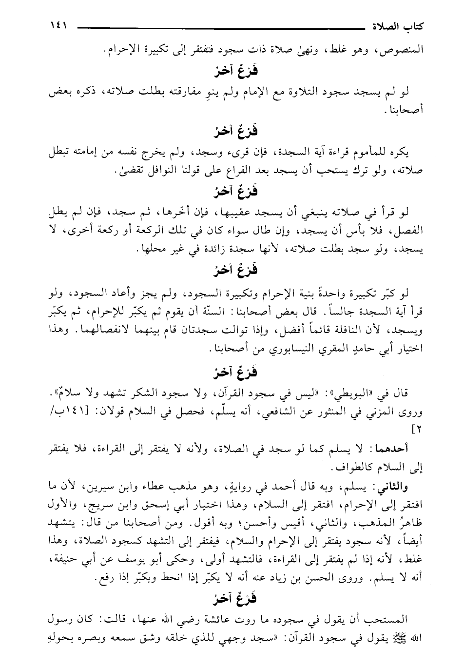 والثاني: يسلم، وبه قال أحمد في رواية، وهو مذهب عطا، وابن سيرين، لأن ما افتقر إلى الإحرام، افتقر إلى السلام، وهذا اختيار أبي إسحق وابن سريج، والأول ظاهر المذهب، والثاني، أقيس وأحسن؛ وبه أقول. ومن أصحابنا من قال: يتشهد أيضاً، لأنه سجود يفتقر إلى الإحرام والسلام، فيفتقر إلى التشهد كسجود الصلاة، وهذا غلط، لأنه إذا لم يفتقر إلى القراءة، فالتشهد أولى، وحكى أبو يوسف عن أبي حنيفة، أنه لا يسلم. وروى الحسن بن زياد عنه أنه لا يكبر إذا انحط ويكبر إذا رفع.